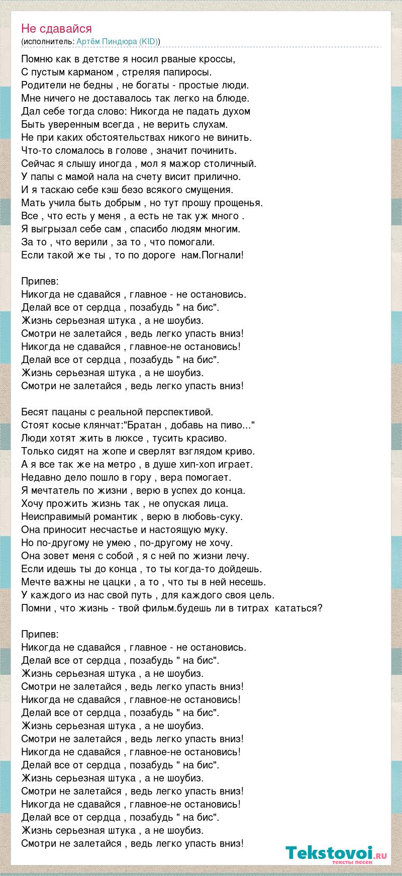 Помню как в детстве я носил рваные кроссы, С пустым карманом , стреляя папиросы. Родители не бедны , не богаты - простые люди. Мне ничего не доставалось так легко на блюде. Дал себе тогда слово: Никогда не падать духом Быть уверенным всегда , не верить слухам. Не при каких обстоятельствах никого не винить. Что-то сломалось в голове , значит починить. Сейчас я слышу иногда , мол я мажор столичный. У папы с мамой нала на счету висит прилично. И я таскаю себе кэш безо всякого смущения. Мать учила быть добрым , но тут прошу прощенья. Все , что есть у меня , а есть не так уж много . Я выгрызал себе сам , спасибо людям многим. За то , что верили , за то , что помогали. Если такой же ты , то по дороге нам.Погнали! Припев: Никогда не сдавайся , главное - не остановись. Делай все от сердца , позабудь " на бис". Жизнь серьезная штука , а не шоубиз. Смотри не залетайся , ведь легко упасть вниз! Никогда не сдавайся , главное-не остановись! Делай все от сердца , позабудь " на бис". Жизнь серьезная штука , а не шоубиз. Смотри не залетайся , ведь легко упасть вниз! Бесят пацаны с реальной перспективой. Стоят косые клянчат:"Братан , добавь на пиво..." Люди хотят жить в люксе , тусить красиво. Только сидят на жопе и сверлят взглядом криво. А я все так же на метро , в душе хип-хоп играет. Недавно дело пошло в гору , вера помогает. Я мечтатель по жизни , верю в успех до конца. Хочу прожить жизнь так , не опуская лица. Неисправимый романтик , верю в любовь-суку. Она приносит несчастье и настоящую муку. Но по-другому не умею , по-другому не хочу. Она зовет меня с собой , я с ней по жизни лечу. Если идешь ты до конца , то ты когда-то дойдешь. Мечте важны не цацки , а то , что ты в ней несешь. У каждого из нас свой путь , для каждого своя цель. Помни , что жизнь - твой фильм.будешь ли в титрах кататься? Припев: Никогда не сдавайся , главное - не остановись. Делай все от сердца , позабудь " на бис". Жизнь серьезная штука , а не шоубиз. Смотри не залетайся , ведь легко упасть вниз! Никогда не сдавайся , главное-не остановись! Делай все от сердца , позабудь " на бис". Жизнь серьезная штука , а не шоубиз. Смотри не залетайся , ведь легко упасть вниз! Никогда не сдавайся , главное-не остановись! Делай все от сердца , позабудь " на бис". Жизнь серьезная штука , а не шоубиз. Смотри не залетайся , ведь легко упасть вниз! Никогда не сдавайся , главное-не остановись! Делай все от сердца , позабудь " на бис". Жизнь серьезная штука , а не шоубиз. Смотри не залетайся , ведь легко упасть вниз!