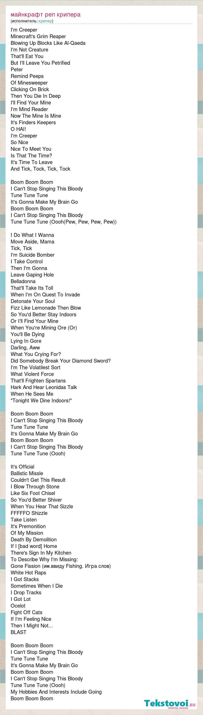 I'm Creeper Minecraft's Grim Reaper Blowing Up Blocks Like Al-Qaeda I'm Not Creature That'll Eat You But I'll Leave You Petrified Peter Remind Peeps Of Minesweeper Clicking On Brick Then You Die In Deep I'll Find Your Mine I'm Mind Reader Now The Mine Is Mine It's Finders Keepers O HAI! I'm Creeper So Nice Nice To Meet You Is That The Time? It's Time To Leave And Tick, Tock, Tick, Tock Boom Boom Boom I Can't Stop Singing This Bloody Tune Tune Tune It's Gonna Make My Brain Go Boom Boom Boom I Can't Stop Singing This Bloody Tune Tune Tune (Oooh(Pew, Pew, Pew, Pew)) I Do What I Wanna Move Aside, Mama Tick, Tick I'm Suicide Bomber I Take Control Then I'm Gonna Leave Gaping Hole Belladonna That'll Take Its Toll When I'm On Quest To Invade Detonate Your Soul Fizz Like Lemonade Then Blow So You'd Better Stay Indoors Or I'll Find Your Mine When You're Mining Ore (Or) You'll Be Dying Lying In Gore Darling, Aww What You Crying For? Did Somebody Break Your Diamond Sword? I'm The Volatilest Sort What Violent Force That'll Frighten Spartans Hark And Hear Leonidas Talk When He Sees Me "Tonight We Dine Indoors!" Boom Boom Boom I Can't Stop Singing This Bloody Tune Tune Tune It's Gonna Make My Brain Go Boom Boom Boom I Can't Stop Singing This Bloody Tune Tune Tune (Oooh) It's Official Ballistic Missle Couldn't Get This Result I Blow Through Stone Like Six Foot Chisel So You'd Better Shiver When You Hear That Sizzle FFFFFO Shizzle Take Listen It's Premonition Of My Mission Death By Demolition If I Don't Come Home There's Sign In My Kitchen To Describe Why I'm Missing: Gone Fission (им.ввиду Fishing. Игра слов) White Hot Raps I Got Stacks Sometimes When I Die I Drop Tracks I Got Lot Ocelot Fight Off Cats If I'm Feeling Nice Then I Might Not... BLAST Boom Boom Boom I Can't Stop Singing This Bloody Tune Tune Tune It's Gonna Make My Brain Go Boom Boom Boom I Can't Stop Singing This Bloody Tune Tune Tune (Oooh) My Hobbies And Interests Include Going Boom Boom Boom
