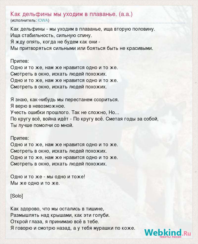 Как дельфины - мы уходим в плаванье, ища вторую половину. Ища стабильность, сильную спину. Я жду опять, когда не будем как они - Мы притворяться сильными или бояться быть не красивыми. Припев: Одно и то же, нам же нравится одно и то же. Смотреть в окно, искать людей похожих. Одно и то же, нам же нравится одно и то же. Смотреть в окно, искать людей похожих. Я знаю, как-нибудь мы перестанем ссориться. Я верю в невозможное. Учесть ошибки прошлого. Так не сложно, Но... По кругу всё, война идёт - По кругу всё. Сметая годы за собой, Ты лучше помолчи со мной. Припев: Одно и то же, нам же нравится одно и то же. Смотреть в окно, искать людей похожих. Одно и то же, нам же нравится одно и то же. Смотреть в окно, искать людей похожих. Одно и то же - мы одно и тоже! Мы же одно и то же. [Solo] Как здорово, что мы остались в тишине, Размышлять над крышами, как эти голуби. Открой глаза, я принимаю всё в тебе. Я говорю и смотрю назад, а у тебя мурашки по коже.