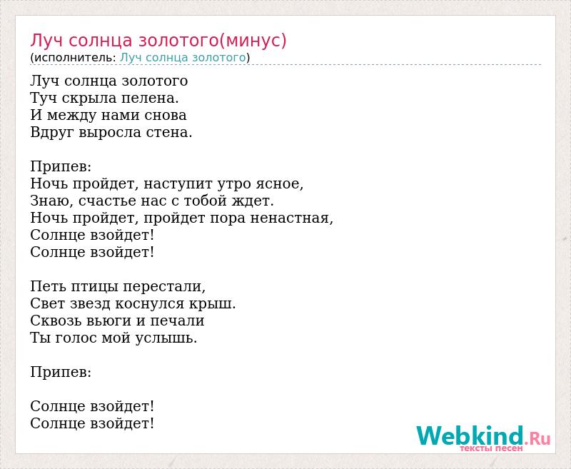 Луч солнца золотого Туч скрыла пелена. И между нами снова Вдруг выросла стена. Припев: Ночь пройдет, наступит утро ясное, Знаю, счастье нас с тобой ждет. Ночь пройдет, пройдет пора ненастная, Солнце взойдет! Солнце взойдет! Петь птицы перестали, Свет звезд коснулся крыш. Сквозь вьюги и печали Ты голос мой услышь. Припев: Солнце взойдет! Солнце взойдет!