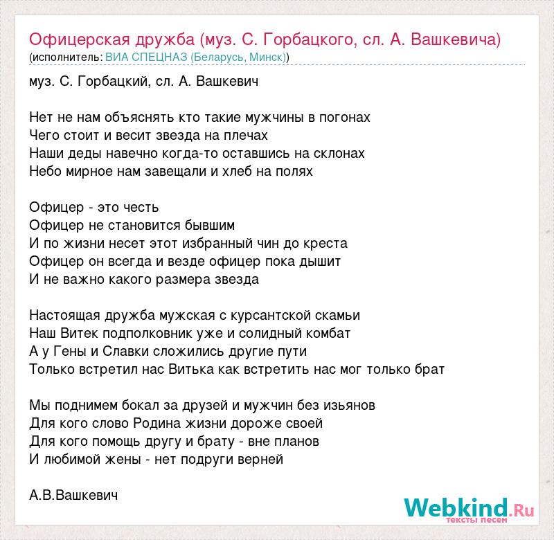 муз. С. Горбацкий, сл. А. Вашкевич Нет не нам объяснять кто такие мужчины в погонах Чего стоит и весит звезда на плечах Наши деды навечно когда-то оставшись на склонах Небо мирное нам завещали и хлеб на полях Офицер - это честь Офицер не становится бывшим И по жизни несет этот избранный чин до креста Офицер он всегда и везде офицер пока дышит И не важно какого размера звезда Настоящая дружба мужская с курсантской скамьи Наш Витек подполковник уже и солидный комбат А у Гены и Славки сложились другие пути Только встретил нас Витька как встретить нас мог только брат Мы поднимем бокал за друзей и мужчин без изьянов Для кого слово Родина жизни дороже своей Для кого помощь другу и брату - вне планов И любимой жены - нет подруги верней А.В.Вашкевич
