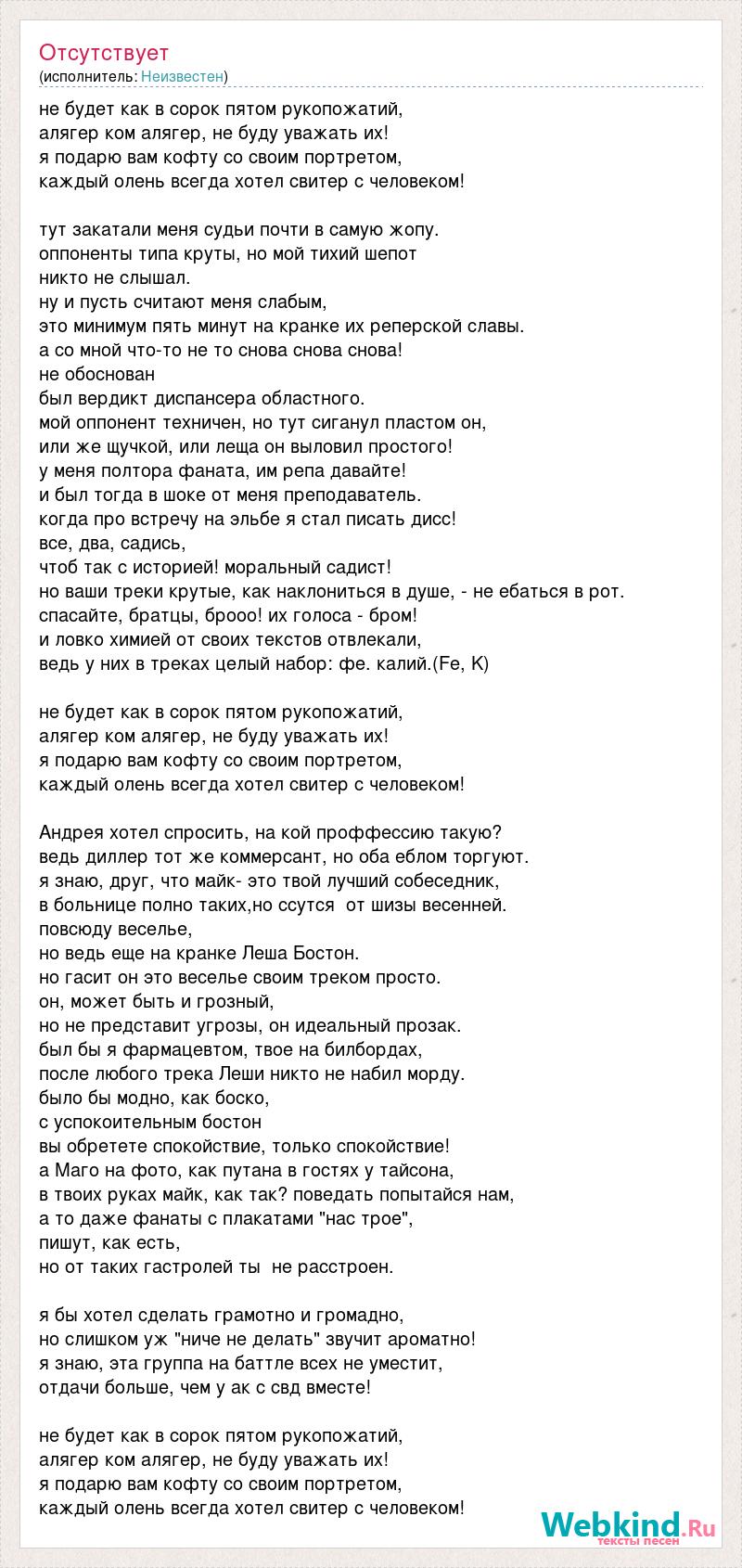 не будет как в сорок пятом рукопожатий, алягер ком алягер, не буду уважать их! я подарю вам кофту со своим портретом, каждый олень всегда хотел свитер с человеком! тут закатали меня судьи почти в самую жопу. оппоненты типа круты, но мой тихий шепот никто не слышал. ну и пусть считают меня слабым, это минимум пять минут на кранке их реперской славы. а со мной что-то не то снова снова снова! не обоснован был вердикт диспансера областного. мой оппонент техничен, но тут сиганул пластом он, или же щучкой, или леща он выловил простого! у меня полтора фаната, им репа давайте! и был тогда в шоке от меня преподаватель. когда про встречу на эльбе я стал писать дисс! все, два, садись, чтоб так с историей! моральный садист! но ваши треки крутые, как наклониться в душе, - не ебаться в рот. спасайте, братцы, брооо! их голоса - бром! и ловко химией от своих текстов отвлекали, ведь у них в треках целый набор: фе. калий.(Fe, K) не будет как в сорок пятом рукопожатий, алягер ком алягер, не буду уважать их! я подарю вам кофту со своим портретом, каждый олень всегда хотел свитер с человеком! Андрея хотел спросить, на кой проффессию такую? ведь диллер тот же коммерсант, но оба еблом торгуют. я знаю, друг, что майк- это твой лучший собеседник, в больнице полно таких,но ссутся от шизы весенней. повсюду веселье, но ведь еще на кранке Леша Бостон. но гасит он это веселье своим треком просто. он, может быть и грозный, но не представит угрозы, он идеальный прозак. был бы я фармацевтом, твое на билбордах, после любого трека Леши никто не набил морду. было бы модно, как боско, с успокоительным бостон вы обретете спокойствие, только спокойствие! а Маго на фото, как путана в гостях у тайсона, в твоих руках майк, как так? поведать попытайся нам, а то даже фанаты с плакатами "нас трое", пишут, как есть, но от таких гастролей ты не расстроен. я бы хотел сделать грамотно и громадно, но слишком уж "ниче не делать" звучит ароматно! я знаю, эта группа на баттле всех не уместит, отдачи больше, чем у ак с свд вместе! не будет как в сорок пятом рукопожатий, алягер ком алягер, не буду уважать их! я подарю вам кофту со своим портретом, каждый олень всегда хотел свитер с человеком!