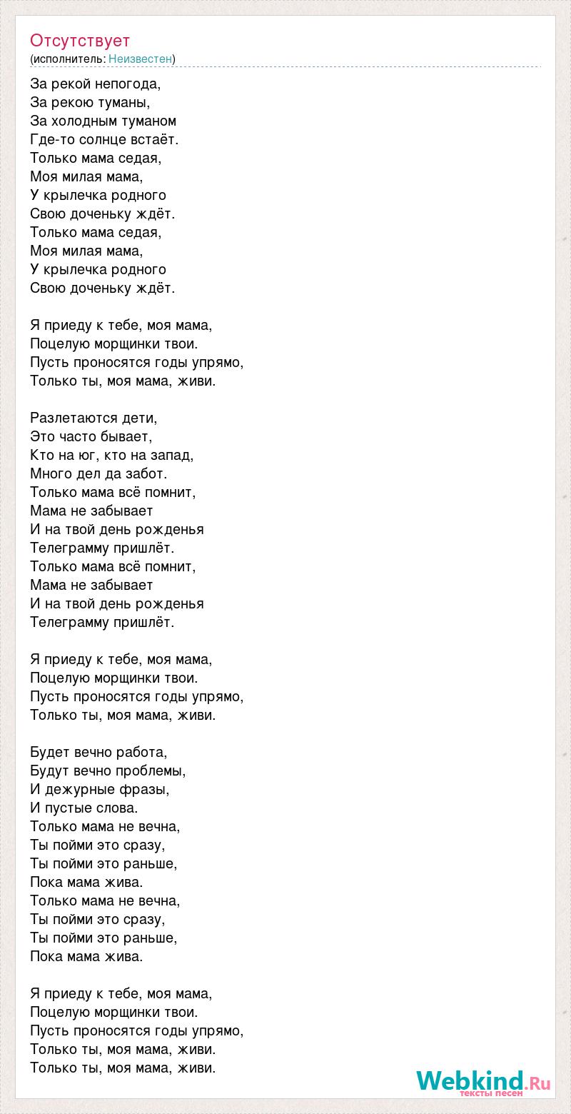 За рекой непогода, За рекою туманы, За холодным туманом Где-то солнце встаёт. Только мама седая, Моя милая мама, У крылечка родного Свою доченьку ждёт. Только мама седая, Моя милая мама, У крылечка родного Свою доченьку ждёт. Я приеду к тебе, моя мама, Поцелую морщинки твои. Пусть проносятся годы упрямо, Только ты, моя мама, живи. Разлетаются дети, Это часто бывает, Кто на юг, кто на запад, Много дел да забот. Только мама всё помнит, Мама не забывает И на твой день рожденья Телеграмму пришлёт. Только мама всё помнит, Мама не забывает И на твой день рожденья Телеграмму пришлёт. Я приеду к тебе, моя мама, Поцелую морщинки твои. Пусть проносятся годы упрямо, Только ты, моя мама, живи. Будет вечно работа, Будут вечно проблемы, И дежурные фразы, И пустые слова. Только мама не вечна, Ты пойми это сразу, Ты пойми это раньше, Пока мама жива. Только мама не вечна, Ты пойми это сразу, Ты пойми это раньше, Пока мама жива. Я приеду к тебе, моя мама, Поцелую морщинки твои. Пусть проносятся годы упрямо, Только ты, моя мама, живи. Только ты, моя мама, живи.