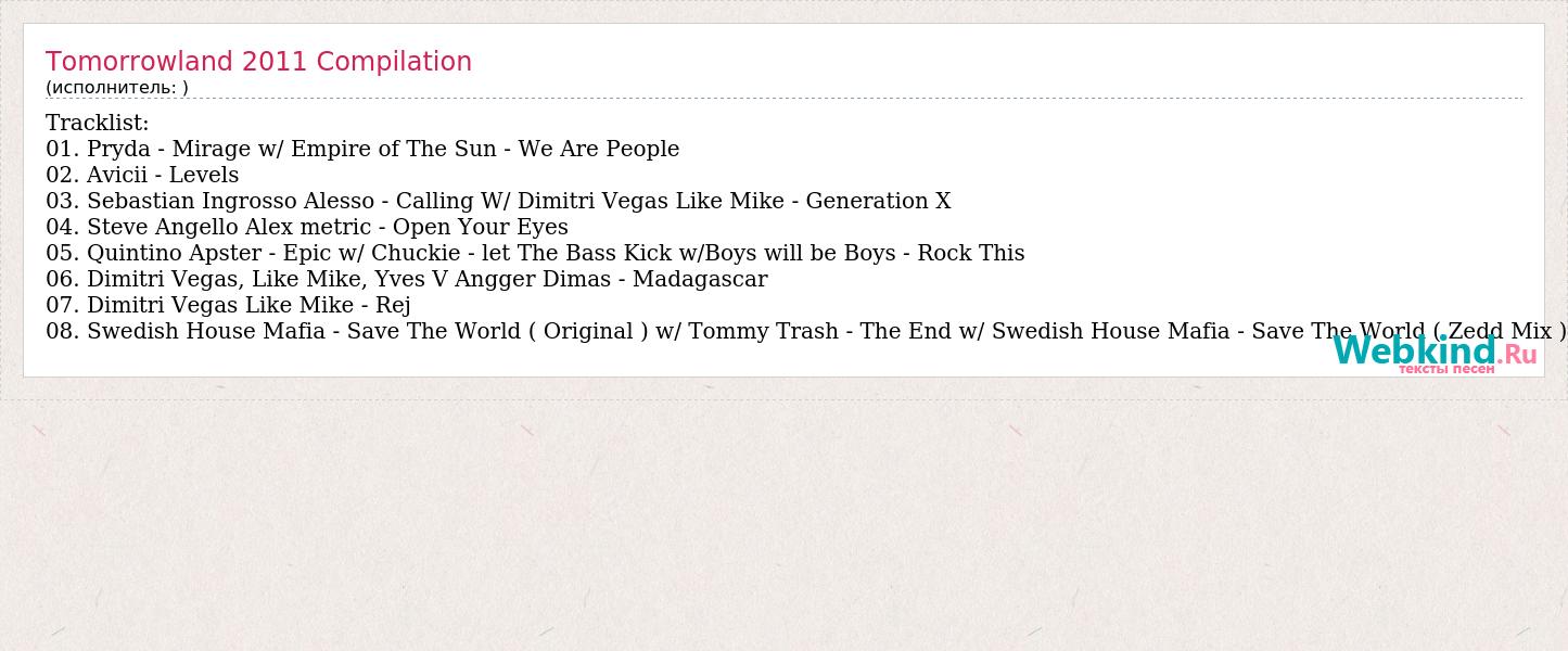 Главная→Исполнители→David Guetta, Swedish House Mafia, Armin van Buuren,→Tomorrowland 2011 Compilation
