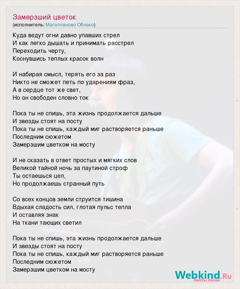 Куда ведут огни давно упавших стрел И как легко дышать и принимать расстрел Переходить черту, Коснувшись теплых красок волн И набирая смысл, терять его за раз Никто не сможет петь по ударениям фраз, А в сердце тот же свет, Но он свободен словно ток Пока ты не спишь, эта жизнь продолжается дальше И звезды стоят на посту Пока ты не спишь, каждый миг растворяется раньше Последним сюжетом Замерзшим цветком на мосту И не сказать в ответ простых и мягких слов Великой тайной ночь за паутиной строф Ты остаешься цел, Но продолжаешь странный путь Со всех концов земли струится тишина Вдыхая сладость сил, глотая пульс тепла И оставляя знак На ткани тающих светил Пока ты не спишь, эта жизнь продолжается дальше И звезды стоят на посту Пока ты не спишь, каждый миг растворяется раньше Последним сюжетом Замерзшим цветком на мосту