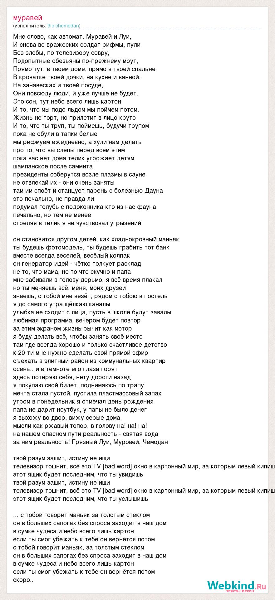 Мне слово, как автомат, Муравей и Луи, И снова во вражеских солдат рифмы, пули Без злобы, по телевизору совру, Подопытные обезьяны по-прежнему мрут, Прямо тут, в твоем доме, прямо в твоей спальне В кроватке твоей дочки, на кухне и ванной. На занавесках и твоей посуде, Они повсюду люди, и уже лучше не будет. Это сон, тут небо всего лишь картон И то, что мы подо льдом мы поймем потом. Жизнь не торт, но прилетит в лицо круто И то, что ты труп, ты поймешь, будучи трупом пока не обули в тапки белые мы рифмуем ежедневно, а хули нам делать про то, что вы слепы перед всем этим пока вас нет дома телик угрожает детям шампанское после саммита президенты соберутся возле плазмы в сауне не отвлекай их - они очень заняты там им споёт и станцует парень с болезнью Дауна это печально, не правда ли подумал голубь с подоконника кто из нас фауна печально, но тем не менее стреляя в телик я не чувствовал угрызений он становится другом детей, как хладнокровный маньяк ты будешь фотомодель, ты будешь грабить тот банк вместе всегда веселей, весёлый колпак он генератор идей - чётко толкует расклад не то, что мама, не то что скучно и папа мне забивали в голову дерьмо, я всё время плакал но ты меняешь всё, меня, моих друзей знаешь, с тобой мне везёт, рядом с тобою в постель я до самого утра щёлкаю каналы улыбка не сходит с лица, пусть в школе будут завалы любимая программа, вечером будет повтор за этим экраном жизнь рычит как мотор я буду делать всё, чтобы занять своё место там где всегда хорошо и только счастливое детство к 20-ти мне нужно сделать свой прямой эфир съехать в элитный район из коммунальных квартир осень.. и в темноте его глаза горят здесь потеряю себя, нету дороги назад я покупаю свой билет, поднимаюсь по трапу мечта стала пустой, пустила пластмассовый запах утром в понедельник я отмечал день рождения папа не дарит ноутбук, у папы не было денег я выхожу во двор, вижу серые дома мысли как ржавый топор, в голову на! на! на! на нашем опасном пути реальность - святая вода за ним реальность! Грязный Луи, Муровей, Чемодан твой разум зашит, истину не ищи телевизор тошнит, всё это TV [bad word] окно в картонный мир, за которым левый кипиш этот ящик будет последним, что ты увидишь твой разум зашит, истину не ищи телевизор тошнит, всё это TV [bad word] окно в картонный мир, за которым левый кипиш этот ящик будет последним, что ты услышишь ... с тобой говорит маньяк за толстым стеклом он в больших сапогах без спроса заходит в наш дом в сумке чудеса и небо всего лишь картон если ты смог убежать к тебе он вернётся потом с тобой говорит маньяк, за толстым стеклом он в больших сапогах без спроса заходит в наш дом в сумке чудеса и небо всего лишь картон если ты смог убежать к тебе он вернётся потом скоро..