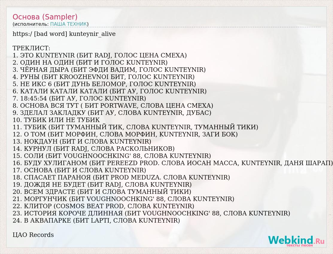 https:/ [bad word] kunteynir_alive ТРЕКЛИСТ: 1. ЭТО KUNTEYNIR (БИТ RADJ, ГОЛОС ЦЕНА СМЕХА) 2. ОДИН НА ОДИН (БИТ И ГОЛОС KUNTEYNIR) 3. ЧЁРНАЯ ДЫРА (БИТ ЭФДИ ВАДИМ, ГОЛОС KUNTEYNIR) 4. РУНЫ (БИТ KROOZHEVNOI БИТ, ГОЛОС KUNTEYNIR) 5. НЕ ИКС 6 (БИТ ДУНЬ БЕЛОМОР, ГОЛОС KUNTEYNIR) 6. КАТАЛИ КАТАЛИ КАТАЛИ (БИТ АУ, ГОЛОС KUNTEYNIR) 7. 18:45:54 (БИТ АУ, ГОЛОС KUNTEYNIR) 8. ОСНОВА ВСЯ ТУТ ( БИТ PORTWAVE, СЛОВА ЦЕНА СМЕХА) 9. ЗДЕЛАЛ ЗАКЛАДКУ (БИТ АУ, СЛОВА KUNTEYNIR, ДУБАС) 10. ТУБИК ИЛИ НЕ ТУБИК 11. ТУБИК (БИТ ТУМАННЫЙ ТИК, СЛОВА KUNTEYNIR, ТУМАННЫЙ ТИКИ) 12. О ТОМ (БИТ МОРФИН, СЛОВА МОРФИН, KUNTEYNIR, ЗАГИ БОК) 13. НОКДАУН (БИТ И СЛОВА KUNTEYNIR) 14. КУРНУЛ (БИТ RADJ, СЛОВА РАСКОЛЬНИКОВ) 15. СОЛИ (БИТ VOUGHNOOCHKING' 88, СЛОВА KUNTEYNIR) 16. БУДУ ХУЛИГАНОМ (БИТ PEREEZD PROD. СЛОВА ИОСАН МАССА, KUNTEYNIR, ДАНЯ ШАРАП) 17. OCНОВА (БИТ И СЛОВА KUNTEYNIR) 18. СПАСАЕТ ПАРАНОЯ (БИТ PROD MEDUZA. CЛОВА KUNTEYNIR) 19. ДОЖДЯ НЕ БУДЕТ (БИТ RADJ, СЛОВА KUNTEYNIR) 20. ВСЕМ ЗДРАСТЕ (БИТ И СЛОВА ТУМАННЫЙ ТИКИ) 21. МОРГУНЧИК (БИТ VOUGHNOOCHKING' 88, CЛОВА KUNTEYNIR) 22. КЛИТОР (COSMOS BEAT PROD, СЛОВА KUNTEYNIR) 23. ИСТОРИЯ КОРОЧЕ ДЛИННАЯ (БИТ VOUGHNOOCHKING' 88, СЛОВА KUNTEYNIR) 24. В АКВАПАРКЕ (БИТ LAPTI, СЛОВА KUNTEYNIR) ЦАО Records
