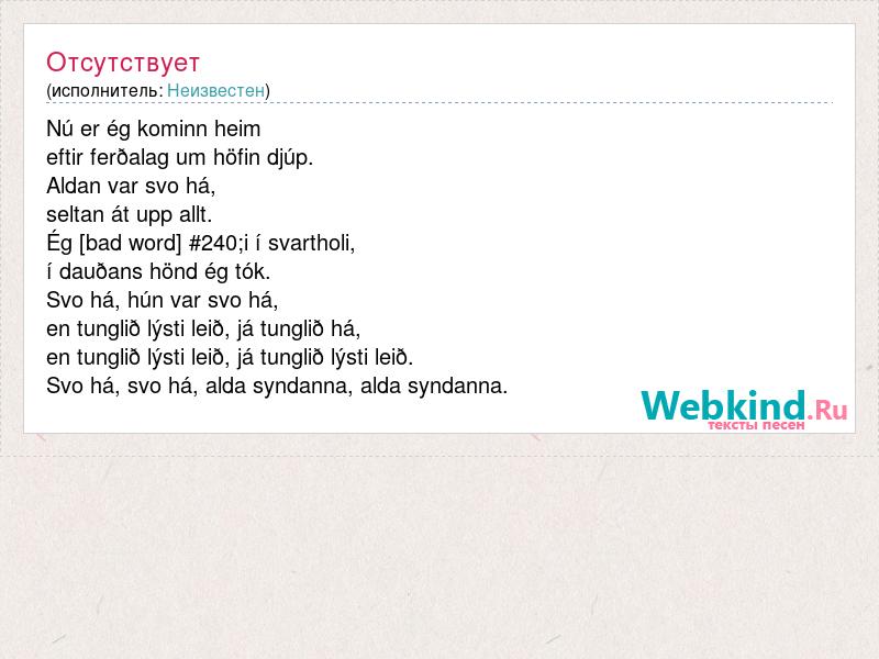 Nú er ég kominn heim eftir ferðalag um höfin djúp. Aldan var svo há, seltan át upp allt. Ég [bad word] #240;i í svartholi, í dauðans hönd ég tók. Svo há, hún var svo há, en tunglið lýsti leið, já tunglið há, en tunglið lýsti leið, já tunglið lýsti leið. Svo há, svo há, alda syndanna, alda syndanna.