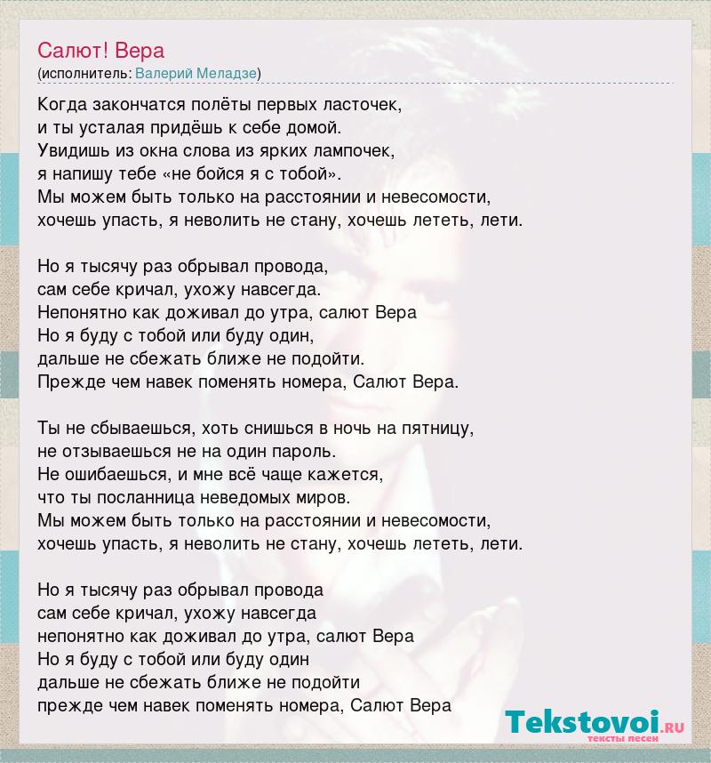 Когда закончатся полёты первых ласточек, и ты усталая придёшь к себе домой. Увидишь из окна слова из ярких лампочек, я напишу тебе «не бойся я с тобой». Мы можем быть только на расстоянии и невесомости, хочешь упасть, я неволить не стану, хочешь лететь, лети. Но я тысячу раз обрывал провода, сам себе кричал, ухожу навсегда. Непонятно как доживал до утра, салют Вера Но я буду с тобой или буду один, дальше не сбежать ближе не подойти. Прежде чем навек поменять номера, Салют Вера. Ты не сбываешься, хоть снишься в ночь на пятницу, не отзываешься не на один пароль. Не ошибаешься, и мне всё чаще кажется, что ты посланница неведомых миров. Мы можем быть только на расстоянии и невесомости, хочешь упасть, я неволить не стану, хочешь лететь, лети. Но я тысячу раз обрывал провода сам себе кричал, ухожу навсегда непонятно как доживал до утра, салют Вера Но я буду с тобой или буду один дальше не сбежать ближе не подойти прежде чем навек поменять номера, Салют Вера
