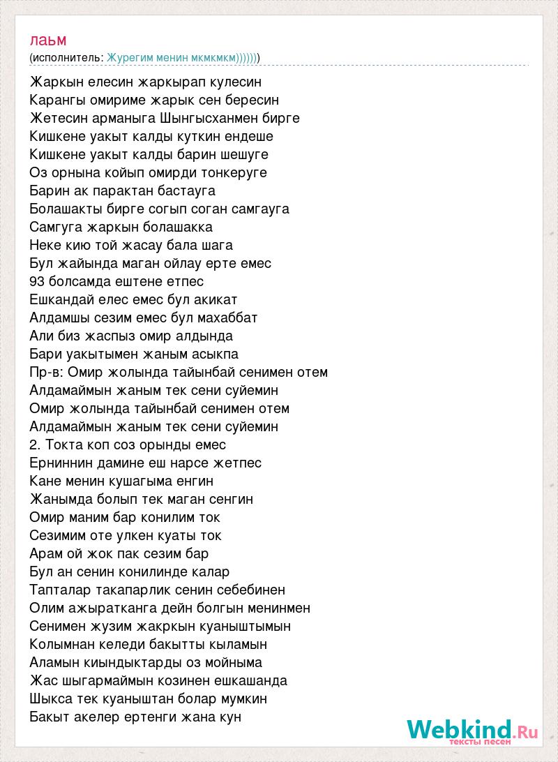 Жаркын елесин жаркырап кулесин Карангы омириме жарык сен бересин Жетесин арманыга Шынгысханмен бирге Кишкене уакыт калды куткин ендеше Кишкене уакыт калды барин шешуге Оз орнына койып омирди тонкеруге Барин ак парактан бастауга Болашакты бирге согып соган самгауга Самгуга жаркын болашакка Неке кию той жасау бала шага Бул жайында маган ойлау ерте емес 93 болсамда ештене етпес Ешкандай елес емес бул акикат Алдамшы сезим емес бул махаббат Али биз жаспыз омир алдында Бари уакытымен жаным асыкпа Пр-в: Омир жолында тайынбай сенимен отем Алдамаймын жаным тек сени суйемин Омир жолында тайынбай сенимен отем Алдамаймын жаным тек сени суйемин 2. Токта коп соз орынды емес Ерниннин дамине еш нарсе жетпес Кане менин кушагыма енгин Жанымда болып тек маган сенгин Омир маним бар конилим ток Сезимим оте улкен куаты ток Арам ой жок пак сезим бар Бул ан сенин конилинде калар Тапталар такапарлик сенин себебинен Олим ажыратканга дейн болгын менинмен Сенимен жузим жакркын куаныштымын Колымнан келеди бакытты кыламын Аламын киындыктарды оз мойныма Жас шыгармаймын козинен ешкашанда Шыкса тек куаныштан болар мумкин Бакыт акелер ертенги жана кун