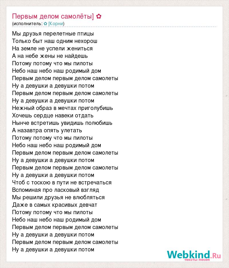 Мы друзья перелетные птицы Только быт наш одним нехорош На земле не успели жениться А на небе жены не найдешь Потому потому что мы пилоты Небо наш небо наш родимый дом Первым делом первым делом самолеты Ну а девушки а девушки потом Первым делом первым делом самолеты Ну а девушки а девушки потом Нежный образ в мечтах приголубишь Хочешь сердце навеки отдать Нынче встретишь увидишь полюбишь А назавтра опять улетать Потому потому что мы пилоты Небо наш небо наш родимый дом Первым делом первым делом самолеты Ну а девушки а девушки потом Первым делом первым делом самолеты Ну а девушки а девушки потом Чтоб с тоскою в пути не встречаться Вспоминая про ласковый взгляд Мы решили друзья не влюбляться Даже в самых красивых девчат Потому потому что мы пилоты Небо наш небо наш родимый дом Первым делом первым делом самолеты Ну а девушки а девушки потом Первым делом первым делом самолеты Ну а девушки а девушки потом