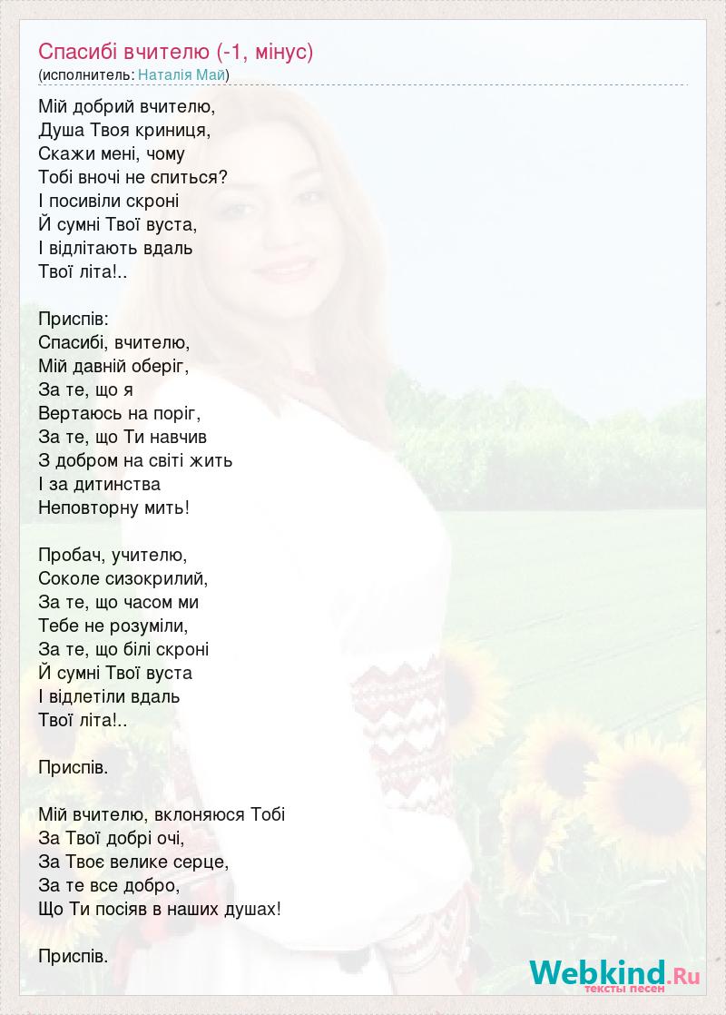 Мій добрий вчителю, Душа Твоя криниця, Скажи мені, чому Тобі вночі не спиться? І посивіли скроні Й сумні Твої вуста, І відлітають вдаль Твої літа!.. Приспів: Спасибі, вчителю, Мій давній оберіг, За те, що я Вертаюсь на поріг, За те, що Ти навчив З добром на світі жить І за дитинства Неповторну мить! Пробач, учителю, Соколе сизокрилий, За те, що часом ми Тебе не розуміли, За те, що білі скроні Й сумні Твої вуста І відлетіли вдаль Твої літа!.. Приспів. Мій вчителю, вклоняюся Тобі За Твої добрі очі, За Твоє велике серце, За те все добро, Що Ти посіяв в наших душах! Приспів.