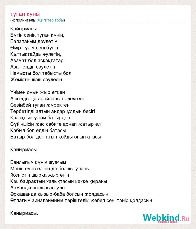 Қайырмасы Бүгін сенің туған күнің, Балапаным дәулетім, Өмір гүлім сені бүгін Құттықтайды әулетің, Азамат бол асқақтатар Азат елдін сәулетін Намысты бол табысты бол Жемістін шаш сәулесін Үнімен онын жыр еткен Ашылды да арайланып әлем есігі Сезімбей туған жүректен Тербетілді алтын айдар ұлдын бесігі Қазақпыз ұлым батырдер Сүйіншісін жас сәбиге арнап жатыр ел Қабыл боп елдін батасы Батыр бол деп атын қойды онын атасы Қайырмасы. Байлығым күнім шуағым Менін емес елінін де болшы ұланы Женістін шырқа жыр әнін Көк байрақтын халықтасын көкке қыраны Арманды жалғаған ұлы Әрқашанда қызыр-баба болсын жолдасын Әппағым айналайыным періштелік жебеп сені тәнір қолдасын Қайырмасы.
