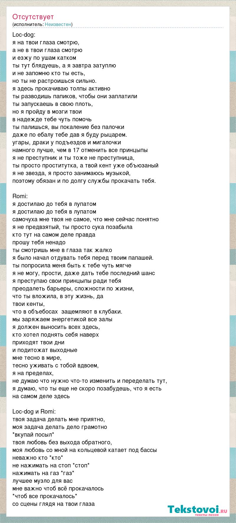 Loc-dog: я на твои глаза смотрю, а не в твои глаза смотрю и езжу по ушам катком ты тут блядуешь, а я завтра затуплю и не запомню кто ты есть, но ты не растроишься сильно. я здесь прокачиваю толпы активно ты разводишь папиков, чтобы они заплатили ты запускаешь в свою плоть, но я пройду в мозги твои в надежде тебе чуть помочь ты палишься, вы покаление без палочки даже по ебалу тебе дав я буду рыцарем. угары, драки у подъездов и мигалочки намного лучше, чем в 17 отменить все принцыпы я не преступник и ты тоже не преступница, ты просто проститутка, а твой кент уже объюзаный я не звезда, я просто занимаюсь музыкой, поэтому обязан и по долгу службы прокачать тебя. Romi: я достилаю до тебя в лупатом я достилаю до тебя в лупатом самочуха мне твоя не самое, что мне сейчас понятно я не предвзятый, ты просто сука позабыла кто тут на самом деле правда прошу тебя ненадо ты смотришь мне в глаза так жалко я было начал отдувать тебя перед твоим папашей. ты попросила меня быть к тебе чуть мягче я не могу, прости, даже дать тебе последний шанс я преступаю свои принцыпы ради тебя преодалеть барьеры, сложности по жизни, что ты вложила, в эту жизнь, да твои кенты, что в объебосах защемляют в клубаки. мы заряжаем энергетикой все залы я должен выносить всех здесь, кто хотел поднять себя наверх приходят твои дни и подитожат выходные мне тесно в мире, тесно уживать с тобой вдвоем, я на пределах, не думаю что нужно что-то изменить и переделать тут, я думаю, что ты еще не скоро позабудешь, что я есть на самом деле здесь Loc-dog и Romi: твоя задача делать мне приятно, моя задача делать дело грамотно *вкупай посыл* твоя любовь без выхода обратного, моя любовь со мной на кольцевой катает под бассы неважно кто *кто* не нажимать на стоп *стоп* нажимать на газ *газ* лучшее музло для вас мне важно чтоб всё прокачалось *чтоб все прокачалось* со сцены глядя на твои глаза