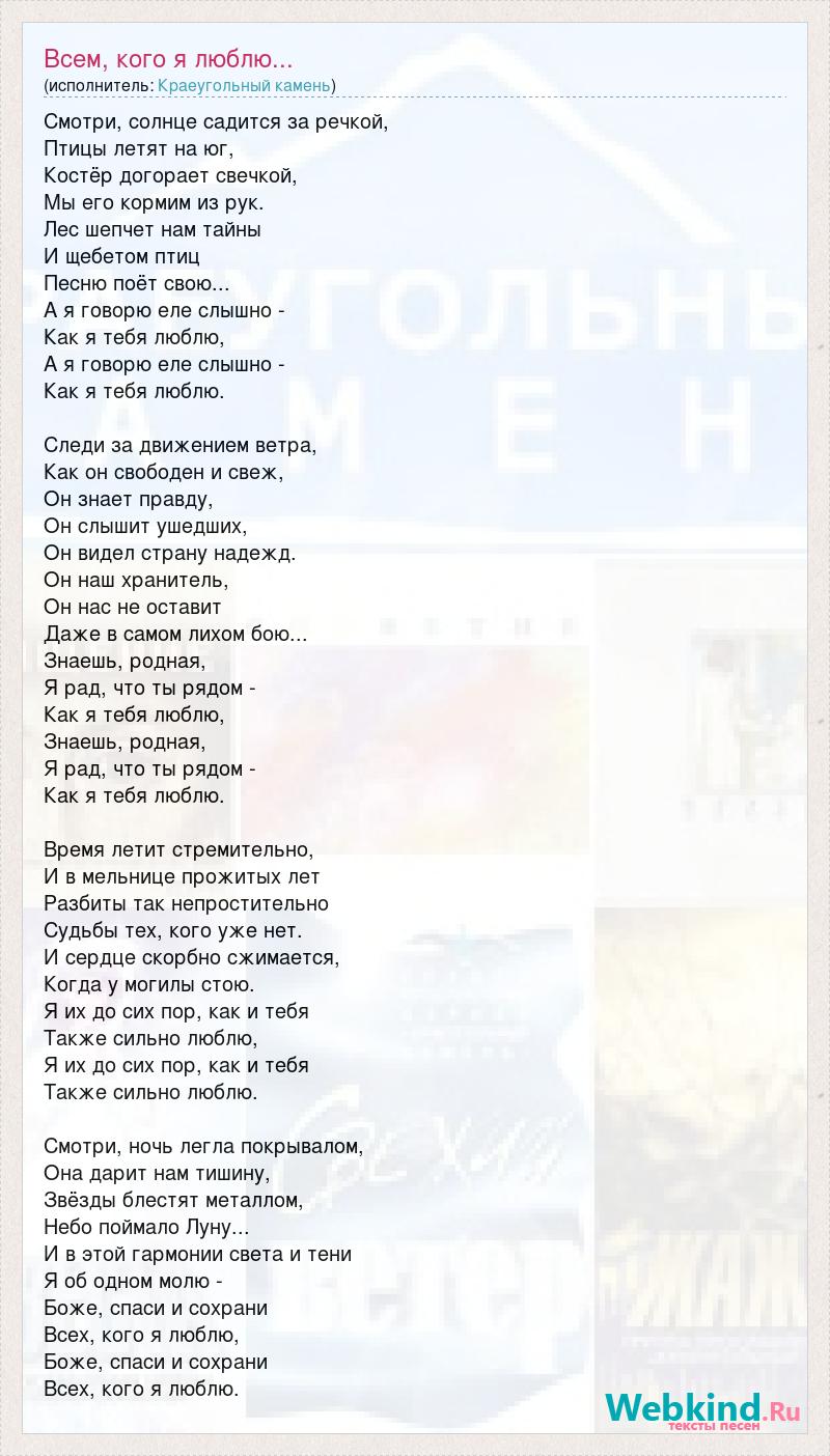 Смотри, солнце садится за речкой, Птицы летят на юг, Костёр догорает свечкой, Мы его кормим из рук. Лес шепчет нам тайны И щебетом птиц Песню поёт свою... А я говорю еле слышно - Как я тебя люблю, А я говорю еле слышно - Как я тебя люблю. Следи за движением ветра, Как он свободен и свеж, Он знает правду, Он слышит ушедших, Он видел страну надежд. Он наш хранитель, Он нас не оставит Даже в самом лихом бою... Знаешь, родная, Я рад, что ты рядом - Как я тебя люблю, Знаешь, родная, Я рад, что ты рядом - Как я тебя люблю. Время летит стремительно, И в мельнице прожитых лет Разбиты так непростительно Судьбы тех, кого уже нет. И сердце скорбно сжимается, Когда у могилы стою. Я их до сих пор, как и тебя Также сильно люблю, Я их до сих пор, как и тебя Также сильно люблю. Смотри, ночь легла покрывалом, Она дарит нам тишину, Звёзды блестят металлом, Небо поймало Луну... И в этой гармонии света и тени Я об одном молю - Боже, спаси и сохрани Всех, кого я люблю, Боже, спаси и сохрани Всех, кого я люблю.