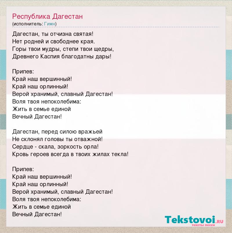 Дагестан, ты отчизна святая! Нет родней и свободнее края. Горы твои мудры, степи твои щедры, Древнего Каспия благодатны дары! Припев: Край наш вершинный! Край наш орлинный! Верой хранимый, славный Дагестан! Воля твоя непоколебима: Жить в семье единой Вечный Дагестан! Дагестан, перед силою вражьей Не склонял головы ты отважной! Сердце - скала, зоркость орла! Кровь героев всегда в твоих жилах текла! Припев: Край наш вершинный! Край наш орлинный! Верой хранимый, славный Дагестан! Воля твоя непоколебима: Жить в семье единой Вечный Дагестан!
