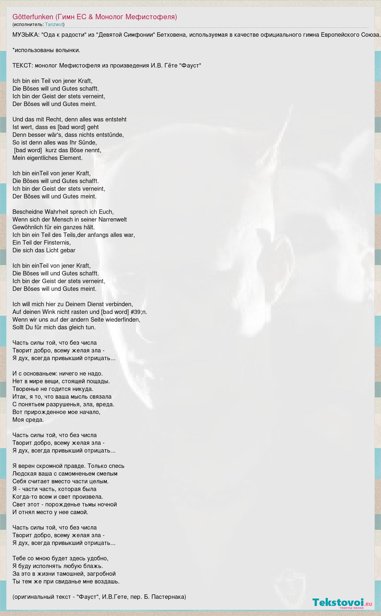 МУЗЫКА: "Ода к радости" из "Девятой Симфонии" Бетховена, используемая в качестве официального гимна Европейского Союза. *использованы волынки. ТЕКСТ: монолог Мефистофеля из произведения И.В. Гёте "Фауст" Ich bin ein Teil von jener Kraft, Die Böses will und Gutes schafft. Ich bin der Geist der stets verneint, Der Böses will und Gutes meint. Und das mit Recht, denn alles was entsteht Ist wert, dass es zugrunde geht Denn besser wär's, dass nichts entstünde, So ist denn alles was Ihr Sünde, Zerstörung, kurz das Böse nennt, Mein eigentliches Element. Ich bin einTeil von jener Kraft, Die Böses will und Gutes schafft. Ich bin der Geist der stets verneint, Der Böses will und Gutes meint. Bescheidne Wahrheit sprech ich Euch, Wenn sich der Mensch in seiner Narrenwelt Gewöhnlich für ein ganzes hält. Ich bin ein Teil des Teils,der anfangs alles war, Ein Teil der Finsternis, Die sich das Licht gebar Ich bin einTeil von jener Kraft, Die Böses will und Gutes schafft. Ich bin der Geist der stets verneint, Der Böses will und Gutes meint. Ich will mich hier zu Deinem Dienst verbinden, Auf deinen Wink nicht rasten und nicht ruh'n. Wenn wir uns auf der andern Seite wiederfinden, Sollt Du für mich das gleich tun. Часть силы той, что без числа Творит добро, всему желая зла - Я дух, всегда привыкший отрицать... И с основаньем: ничего не надо. Нет в мире вещи, стоящей пощады. Творенье не годится никуда. Итак, я то, что ваша мысль связала С понятьем разрушенья, зла, вреда. Вот прирожденное мое начало, Моя среда. Часть силы той, что без числа Творит добро, всему желая зла - Я дух, всегда привыкший отрицать... Я верен скромной правде. Только спесь Людская ваша с самомненьем смелым Себя считает вместо части целым. Я - части часть, которая была Когда-то всем и свет произвела. Свет этот - порожденье тьмы ночной И отнял место у нее самой. Часть силы той, что без числа Творит добро, всему желая зла - Я дух, всегда привыкший отрицать... Тебе со мною будет здесь удобно, Я буду исполнять любую блажь. За это в жизни тамошней, загробной Ты тем же при свиданье мне воздашь. (оригинальный текст - "Фауст", И.В.Гете, пер. Б. Пастернака)