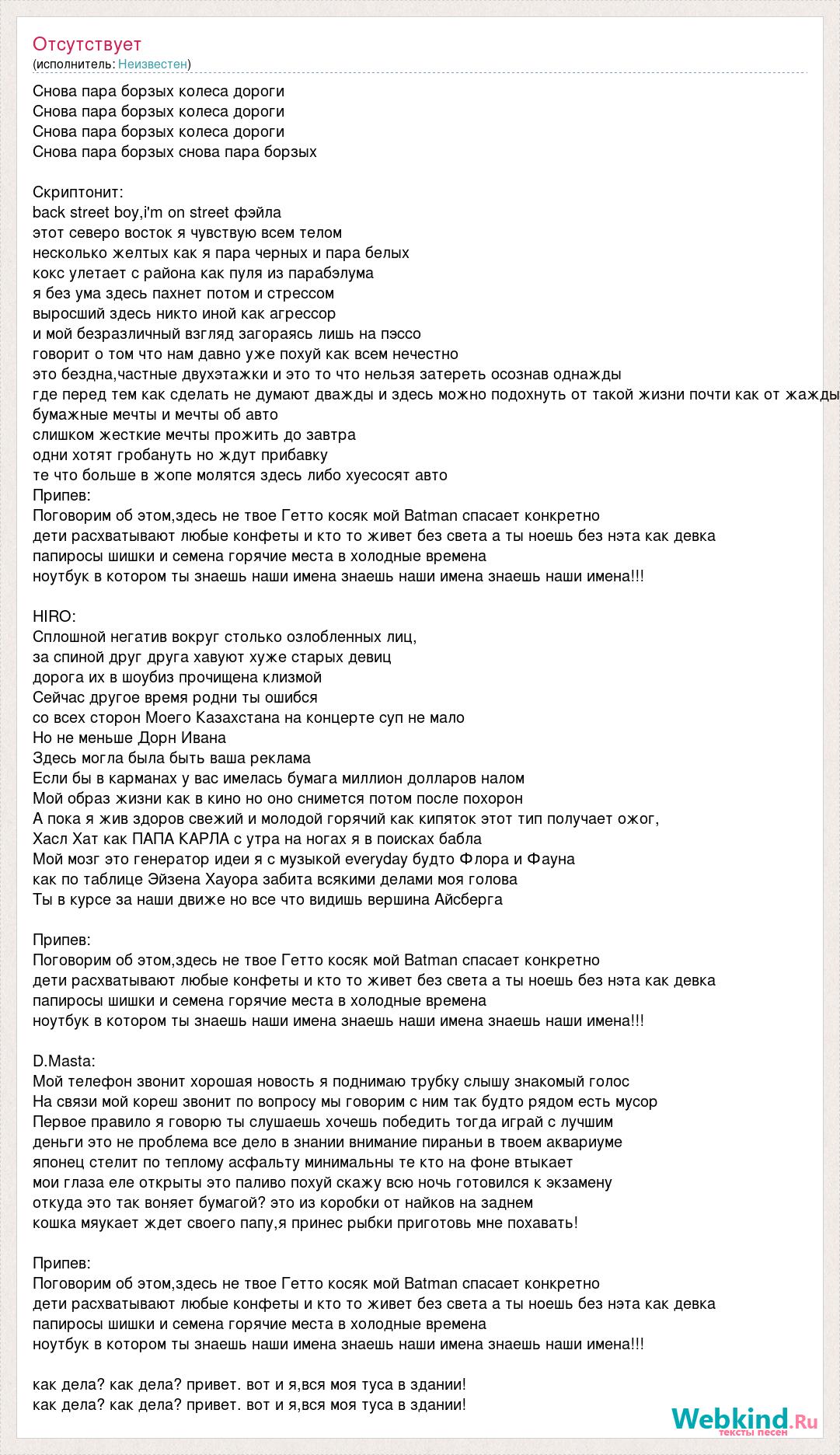 Снова пара борзых колеса дороги Снова пара борзых колеса дороги Снова пара борзых колеса дороги Снова пара борзых снова пара борзых Скриптонит: back street boy,i'm on street фэйла этот северо восток я чувствую всем телом несколько желтых как я пара черных и пара белых кокс улетает с района как пуля из парабэлума я без ума здесь пахнет потом и стрессом выросший здесь никто иной как агрессор и мой безразличный взгляд загораясь лишь на пэссо говорит о том что нам давно уже похуй как всем нечестно это бездна,частные двухэтажки и это то что нельзя затереть осознав однажды где перед тем как сделать не думают дважды и здесь можно подохнуть от такой жизни почти как от жажды бумажные мечты и мечты об авто слишком жесткие мечты прожить до завтра одни хотят гробануть но ждут прибавку те что больше в жопе молятся здесь либо хуесосят авто Припев: Поговорим об этом,здесь не твое Гетто косяк мой Batman спасает конкретно дети расхватывают любые конфеты и кто то живет без света а ты ноешь без нэта как девка папиросы шишки и семена горячие места в холодные времена ноутбук в котором ты знаешь наши имена знаешь наши имена знаешь наши имена!!! HIRO: Сплошной негатив вокруг столько озлобленных лиц, за спиной друг друга хавуют хуже старых девиц дорога их в шоубиз прочищена клизмой Сейчас другое время родни ты ошибся со всех сторон Моего Казахстана на концерте суп не мало Но не меньше Дорн Ивана Здесь могла была быть ваша реклама Если бы в карманах у вас имелась бумага миллион долларов налом Мой образ жизни как в кино но оно снимется потом после похорон А пока я жив здоров свежий и молодой горячий как кипяток этот тип получает ожог, Хасл Хат как ПАПА КАРЛА с утра на ногах я в поисках бабла Мой мозг это генератор идеи я с музыкой everyday будто Флора и Фауна как по таблице Эйзена Хауора забита всякими делами моя голова Ты в курсе за наши движе но все что видишь вершина Айсберга Припев: Поговорим об этом,здесь не твое Гетто косяк мой Batman спасает конкретно дети расхватывают любые конфеты и кто то живет без света а ты ноешь без нэта как девка папиросы шишки и семена горячие места в холодные времена ноутбук в котором ты знаешь наши имена знаешь наши имена знаешь наши имена!!! D.Masta: Мой телефон звонит хорошая новость я поднимаю трубку слышу знакомый голос На связи мой кореш звонит по вопросу мы говорим с ним так будто рядом есть мусор Первое правило я говорю ты слушаешь хочешь победить тогда играй с лучшим деньги это не проблема все дело в знании внимание пираньи в твоем аквариуме японец стелит по теплому асфальту минимальны те кто на фоне втыкает мои глаза еле открыты это паливо похуй скажу всю ночь готовился к экзамену откуда это так воняет бумагой? это из коробки от найков на заднем кошка мяукает ждет своего папу,я принес рыбки приготовь мне похавать! Припев: Поговорим об этом,здесь не твое Гетто косяк мой Batman спасает конкретно дети расхватывают любые конфеты и кто то живет без света а ты ноешь без нэта как девка папиросы шишки и семена горячие места в холодные времена ноутбук в котором ты знаешь наши имена знаешь наши имена знаешь наши имена!!! как дела? как дела? привет. вот и я,вся моя туса в здании! как дела? как дела? привет. вот и я,вся моя туса в здании!