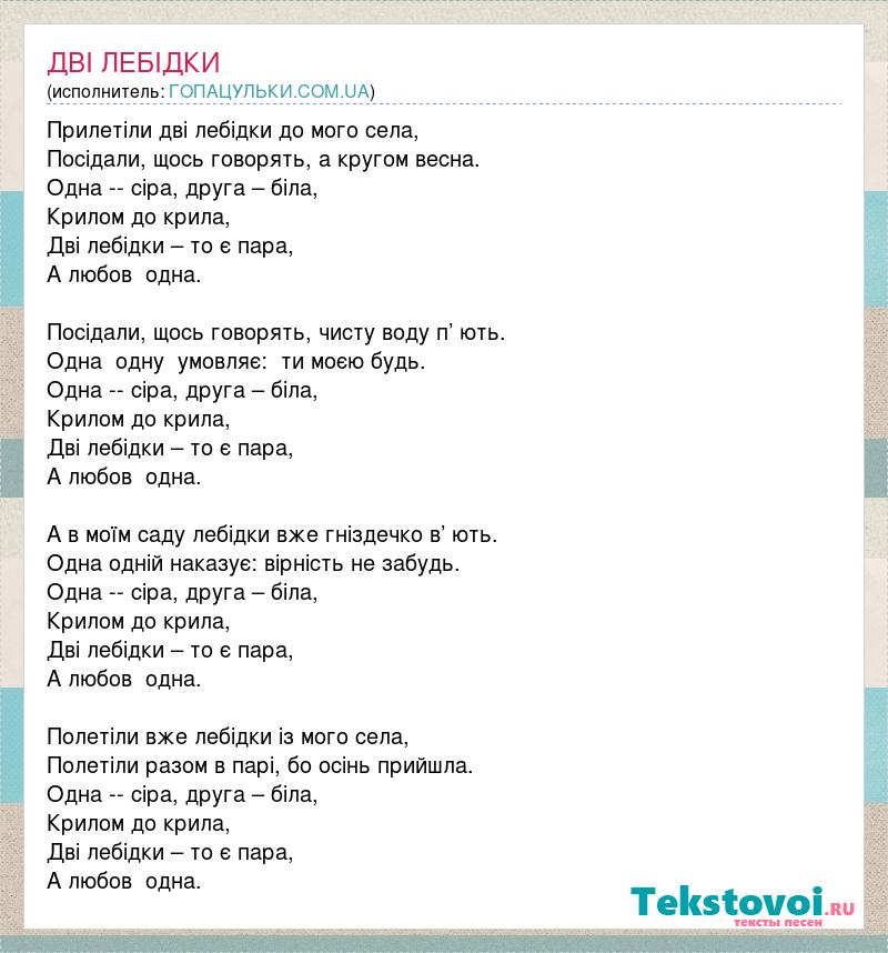 Прилетіли дві лебідки до мого села, Посідали, щось говорять, а кругом весна. Одна -- сіра, друга – біла, Крилом до крила, Дві лебідки – то є пара, А любов одна. Посідали, щось говорять, чисту воду п’ ють. Одна одну умовляє: ти моєю будь. Одна -- сіра, друга – біла, Крилом до крила, Дві лебідки – то є пара, А любов одна. А в моїм саду лебідки вже гніздечко в’ ють. Одна одній наказує: вірність не забудь. Одна -- сіра, друга – біла, Крилом до крила, Дві лебідки – то є пара, А любов одна. Полетіли вже лебідки із мого села, Полетіли разом в парі, бо осінь прийшла. Одна -- сіра, друга – біла, Крилом до крила, Дві лебідки – то є пара, А любов одна.
