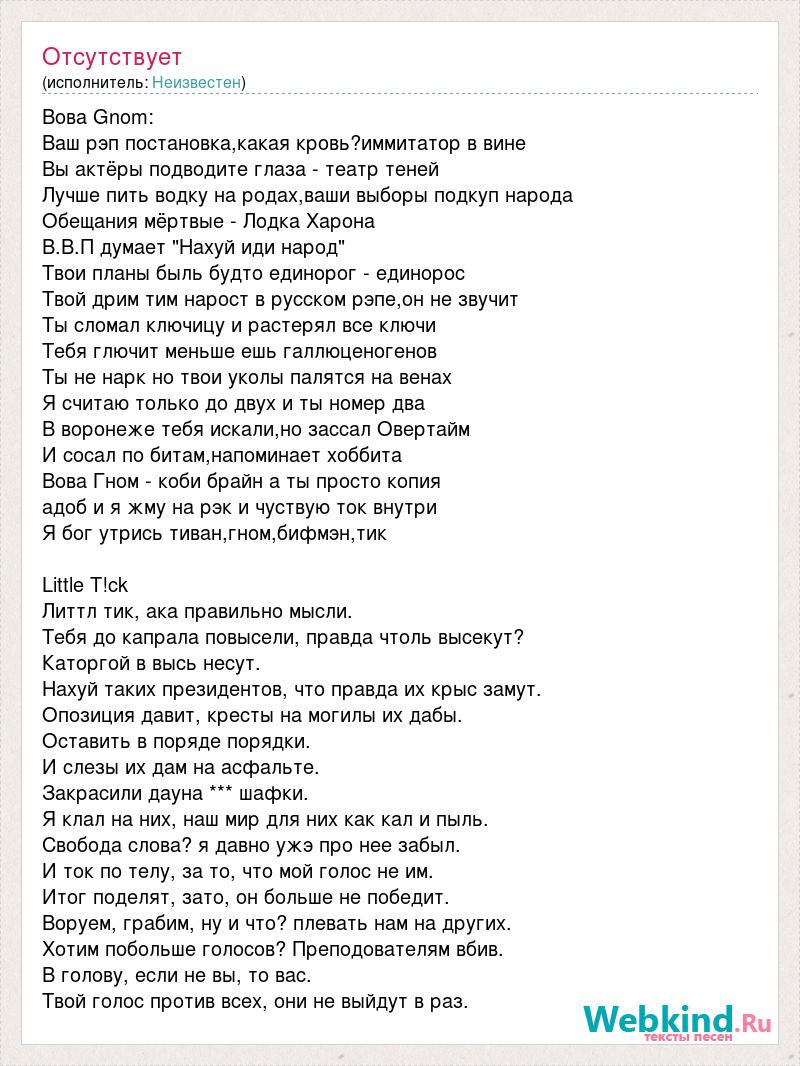 Вова Gnom: Ваш рэп постановка,какая кровь?иммитатор в вине Вы актёры подводите глаза - театр теней Лучше пить водку на родах,ваши выборы подкуп народа Обещания мёртвые - Лодка Харона В.В.П думает "Нахуй иди народ" Твои планы быль будто единорог - единорос Твой дрим тим нарост в русском рэпе,он не звучит Ты сломал ключицу и растерял все ключи Тебя глючит меньше ешь галлюценогенов Ты не нарк но твои уколы палятся на венах Я считаю только до двух и ты номер два В воронеже тебя искали,но зассал Овертайм И сосал по битам,напоминает хоббита Вова Гном - коби брайн а ты просто копия адоб и я жму на рэк и чуствую ток внутри Я бог утрись тиван,гном,бифмэн,тик Little T!ck Литтл тик, ака правильно мысли. Тебя до капрала повысели, правда чтоль высекут? Каторгой в высь несут. Нахуй таких президентов, что правда их крыс замут. Опозиция давит, кресты на могилы их дабы. Оставить в поряде порядки. И слезы их дам на асфальте. Закрасили дауна *** шафки. Я клал на них, наш мир для них как кал и пыль. Свобода слова? я давно ужэ про нее забыл. И ток по телу, за то, что мой голос не им. Итог поделят, зато, он больше не победит. Воруем, грабим, ну и что? плевать нам на других. Хотим побольше голосов? Преподователям вбив. В голову, если не вы, то вас. Твой голос против всех, они не выйдут в раз.