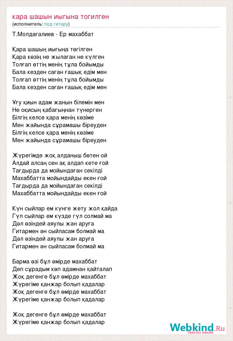 Т.Молдағалиев - Ер махаббат Қара шашың иығыңа төгілген Қара көзің не жылаған не күлген Толғап өттің менің тұла бойымды Бала кезден саған ғашық едім мен Толғап өттің менің тұла бойымды Бала кезден саған ғашық едім мен Ұғу қиын адам жанын білемін мен Не оқисың қабағыңнан түнерген Білгің келсе қара менің көзіме Мен жайында сұрамашы біреуден Білгің келсе қара менің көзіме Мен жайында сұрамашы біреуден Жүрегімде жоқ алданыш бөтен ой Алдай алсаң сен ақ алдап кете ғой Тағдырда да мойындаған секілді Махаббатта мойындайды екен ғой Тағдырда да мойындаған секілді Махаббатта мойындайды екен ғой Күн сыйлар ем күнге жету жол қайда Гүл сыйлар ем күзде гүл солмай ма Дәл өзіндей аяулы жан аруға Гитармен ән сыйласам болмай ма Дәл өзіндей аяулы жан аруға Гитармен ән сыйласам болмай ма Барма өзі бұл өмірде махаббат Деп сұрадым көп адамнан қайталап Жоқ дегенге бұл өмірде махаббат Жүрегіме қанжар болып қадалар Жоқ дегенге бұл өмірде махаббат Жүрегіме қанжар болып қадалар Жоқ дегенге бұл өмірде махаббат Жүрегіме қанжар болып қадалар