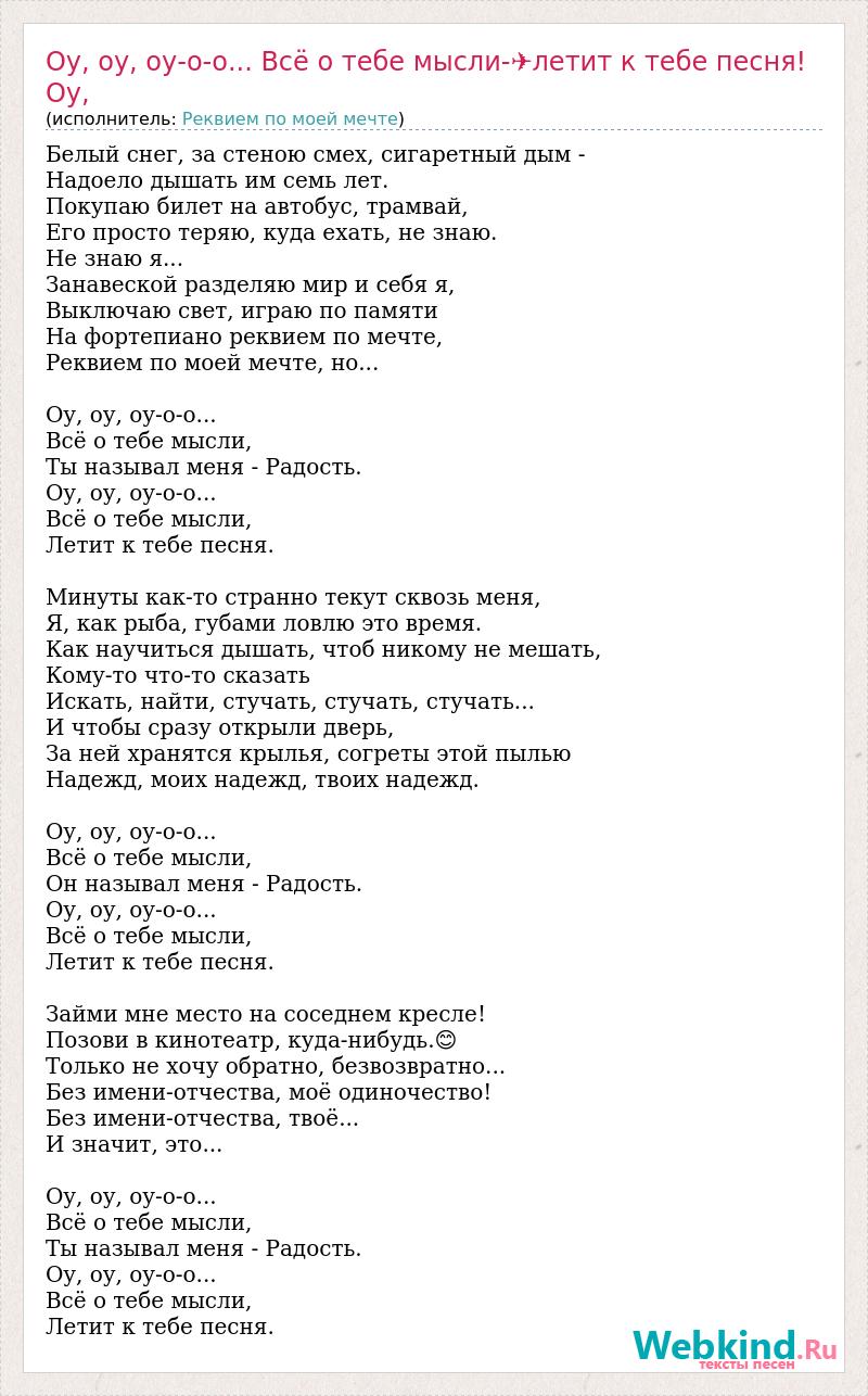 Главная→Исполнители→Реквием по моей мечте→Оу, оу, оу-о-о... Всё о тебе мысли-✈️летит к тебе песня!Оу,
