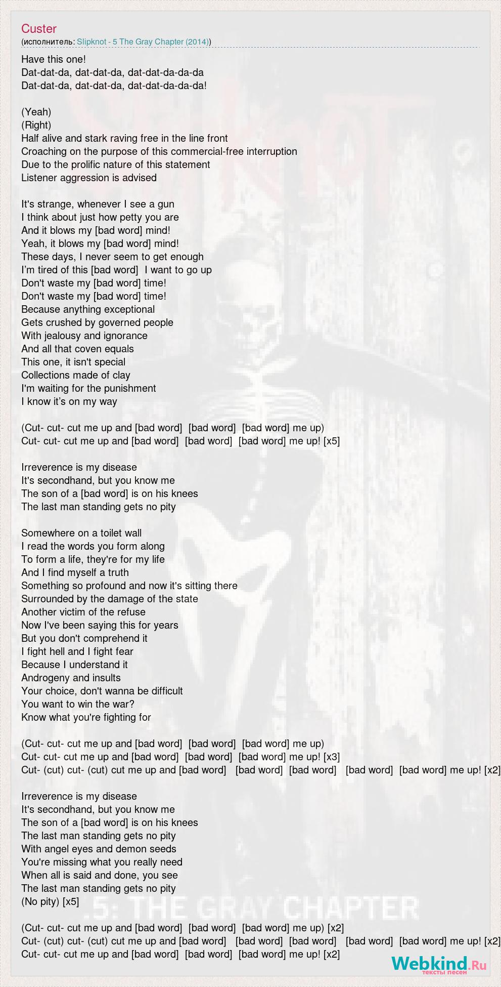 Have this one! Dat-dat-da, dat-dat-da, dat-dat-da-da-da Dat-dat-da, dat-dat-da, dat-dat-da-da-da! (Yeah) (Right) Half alive and stark raving free in the line front Croaching on the purpose of this commercial-free interruption Due to the prolific nature of this statement Listener aggression is advised It's strange, whenever I see a gun I think about just how petty you are And it blows my [bad word] mind! Yeah, it blows my [bad word] mind! These days, I never seem to get enough I’m tired of this [bad word] I want to go up Don't waste my [bad word] time! Don't waste my [bad word] time! Because anything exceptional Gets crushed by governed people With jealousy and ignorance And all that coven equals This one, it isn't special Collections made of clay I'm waiting for the punishment I know it’s on my way (Cut- cut- cut me up and [bad word] [bad word] [bad word] me up) Cut- cut- cut me up and [bad word] [bad word] [bad word] me up! [x5] Irreverence is my disease It's secondhand, but you know me The son of a [bad word] is on his knees The last man standing gets no pity Somewhere on a toilet wall I read the words you form along To form a life, they're for my life And I find myself a truth Something so profound and now it's sitting there Surrounded by the damage of the state Another victim of the refuse Now I've been saying this for years But you don't comprehend it I fight hell and I fight fear Because I understand it Androgeny and insults Your choice, don't wanna be difficult You want to win the war? Know what you're fighting for (Cut- cut- cut me up and [bad word] [bad word] [bad word] me up) Cut- cut- cut me up and [bad word] [bad word] [bad word] me up! [x3] Cut- (cut) cut- (cut) cut me up and [bad word] [bad word] [bad word] [bad word] [bad word] me up! [x2] Irreverence is my disease It's secondhand, but you know me The son of a [bad word] is on his knees The last man standing gets no pity With angel eyes and demon seeds You're missing what you really need When all is said and done, you see The last man standing gets no pity (No pity) [x5] (Cut- cut- cut me up and [bad word] [bad word] [bad word] me up) [x2] Cut- (cut) cut- (cut) cut me up and [bad word] [bad word] [bad word] [bad word] [bad word] me up! [x2] Cut- cut- cut me up and [bad word] [bad word] [bad word] me up! [x2]