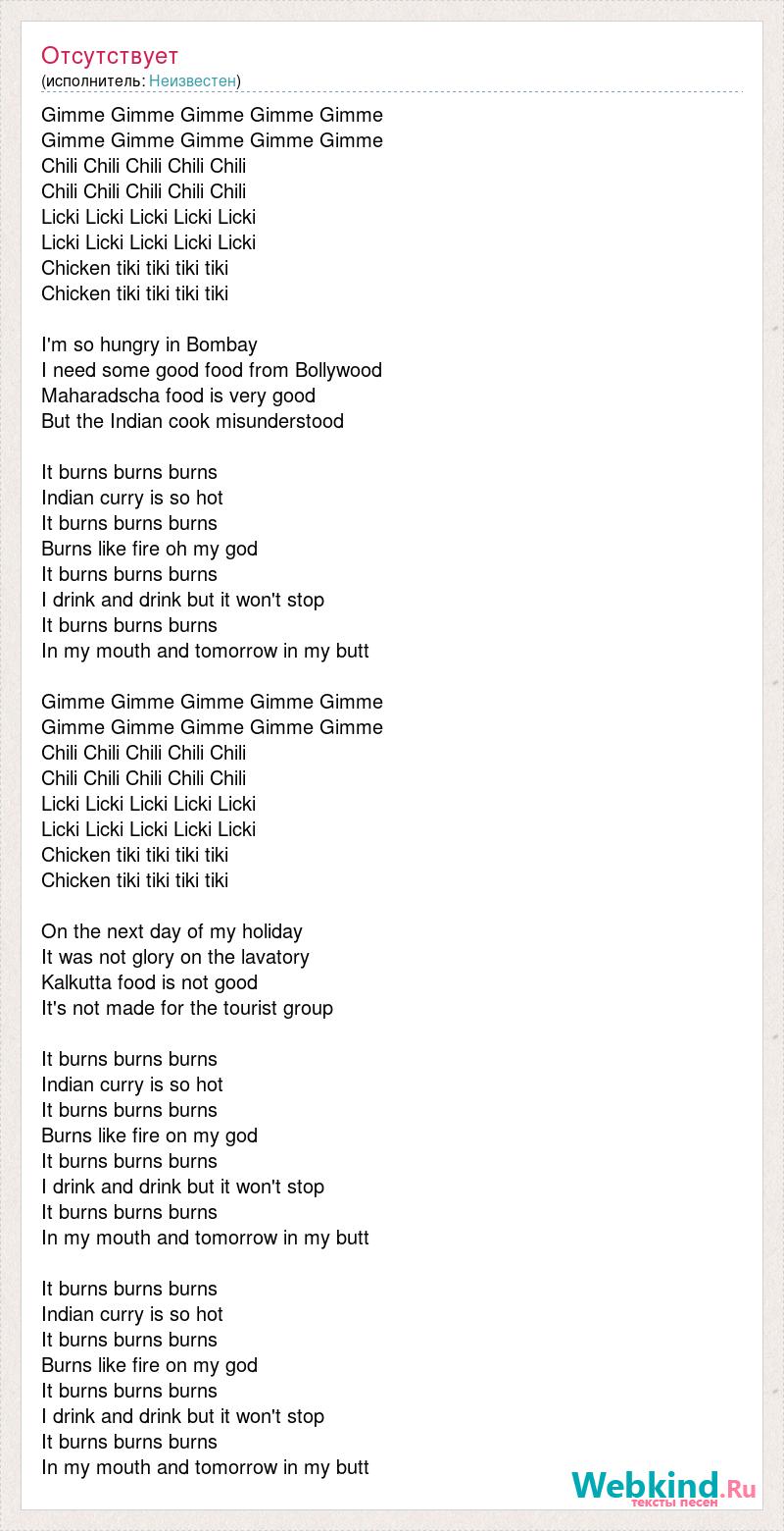 Gimme Gimme Gimme Gimme Gimme Gimme Gimme Gimme Gimme Gimme Chili Chili Chili Chili Chili Chili Chili Chili Chili Chili Licki Licki Licki Licki Licki Licki Licki Licki Licki Licki Chicken tiki tiki tiki tiki Chicken tiki tiki tiki tiki I'm so hungry in Bombay I need some good food from Bollywood Maharadscha food is very good But the Indian cook misunderstood It burns burns burns Indian curry is so hot It burns burns burns Burns like fire oh my god It burns burns burns I drink and drink but it won't stop It burns burns burns In my mouth and tomorrow in my butt Gimme Gimme Gimme Gimme Gimme Gimme Gimme Gimme Gimme Gimme Chili Chili Chili Chili Chili Chili Chili Chili Chili Chili Licki Licki Licki Licki Licki Licki Licki Licki Licki Licki Chicken tiki tiki tiki tiki Chicken tiki tiki tiki tiki On the next day of my holiday It was not glory on the lavatory Kalkutta food is not good It's not made for the tourist group It burns burns burns Indian curry is so hot It burns burns burns Burns like fire on my god It burns burns burns I drink and drink but it won't stop It burns burns burns In my mouth and tomorrow in my butt It burns burns burns Indian curry is so hot It burns burns burns Burns like fire on my god It burns burns burns I drink and drink but it won't stop It burns burns burns In my mouth and tomorrow in my butt
