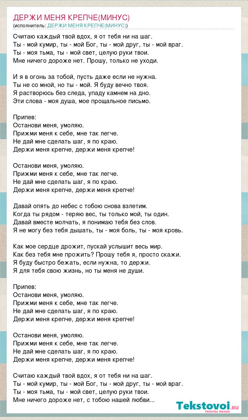 Считаю каждый твой вдох, я от тебя ни на шаг. Ты - мой кумир, ты - мой Бог, ты - мой друг, ты - мой враг. Ты - моя тьма, ты - мой свет, целую руки твои. Мне ничего дороже нет. Прошу, только не уходи. И я в огонь за тобой, пусть даже если не нужна. Ты не со мной, но ты - мой. Я буду вечно твоя. Я растворюсь без следа, упаду камнем на дно. Эти слова - моя душа, мое прощальное письмо. Припев: Останови меня, умоляю. Прижми меня к себе, мне так легче. Не дай мне сделать шаг, я по краю. Держи меня крепче, держи меня крепче! Останови меня, умоляю. Прижми меня к себе, мне так легче. Не дай мне сделать шаг, я по краю. Держи меня крепче, держи меня крепче! Давай опять до небес с тобою снова взлетим. Когда ты рядом - теряю вес, ты только мой, ты один. Давай вместе молчать, я понимаю тебя без слов. Я не могу без тебя дышать, ты - моя боль, ты - моя кровь. Как мое сердце дрожит, пускай услышит весь мир. Как без тебя мне прожить? Прошу тебя я, просто скажи. Я буду быстро бежать, если нужна, то держи. Я для тебя свою жизнь, но ты меня не души. Припев: Останови меня, умоляю. Прижми меня к себе, мне так легче. Не дай мне сделать шаг, я по краю. Держи меня крепче, держи меня крепче! Останови меня, умоляю. Прижми меня к себе, мне так легче. Не дай мне сделать шаг, я по краю. Держи меня крепче, держи меня крепче! Считаю каждый твой вдох, я от тебя ни на шаг. Ты - мой кумир, ты - мой Бог, ты - мой друг, ты - мой враг. Ты - моя тьма, ты - мой свет, целую руки твои. Мне ничего дороже нет, с тобою нашей любви...