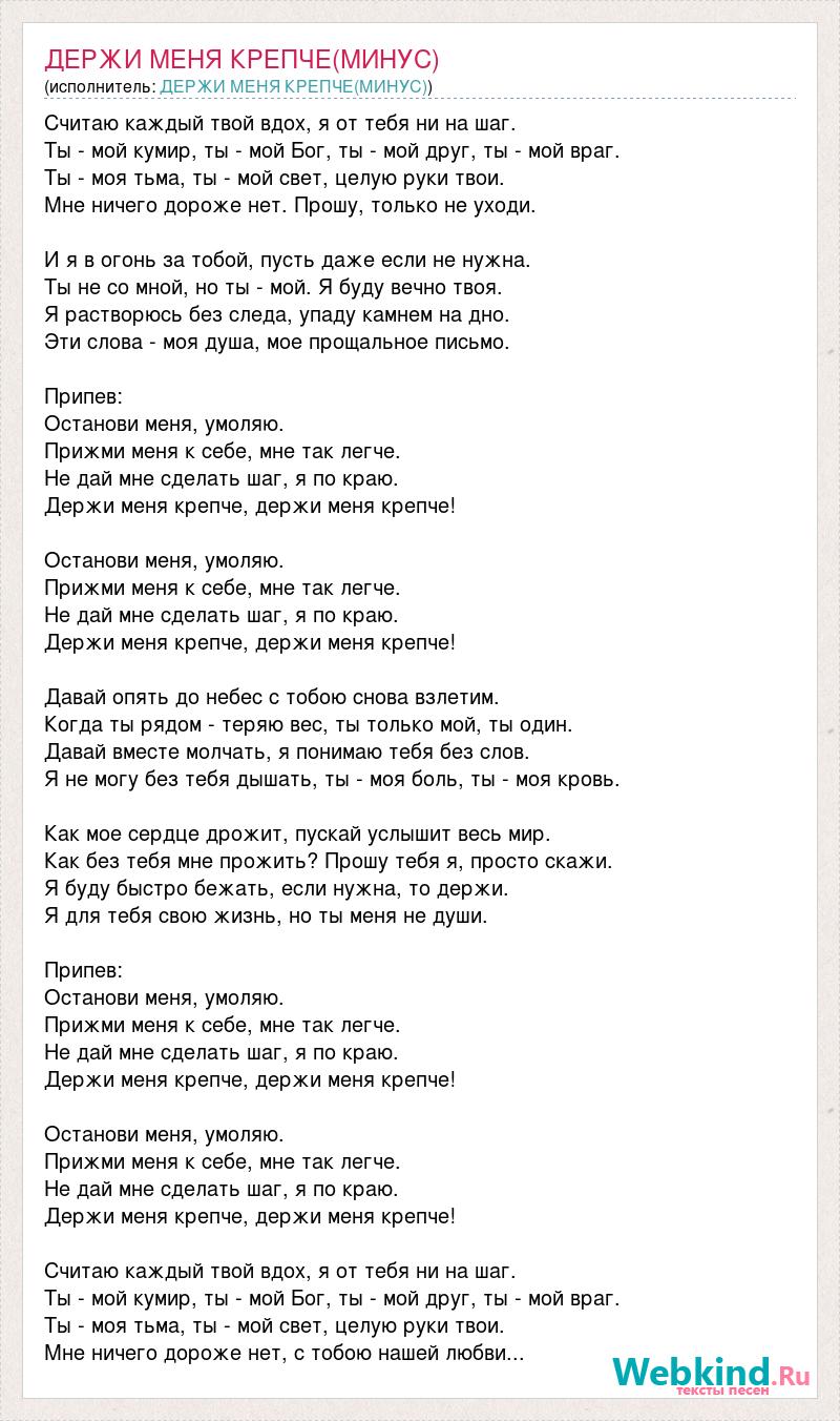 Считаю каждый твой вдох, я от тебя ни на шаг. Ты - мой кумир, ты - мой Бог, ты - мой друг, ты - мой враг. Ты - моя тьма, ты - мой свет, целую руки твои. Мне ничего дороже нет. Прошу, только не уходи. И я в огонь за тобой, пусть даже если не нужна. Ты не со мной, но ты - мой. Я буду вечно твоя. Я растворюсь без следа, упаду камнем на дно. Эти слова - моя душа, мое прощальное письмо. Припев: Останови меня, умоляю. Прижми меня к себе, мне так легче. Не дай мне сделать шаг, я по краю. Держи меня крепче, держи меня крепче! Останови меня, умоляю. Прижми меня к себе, мне так легче. Не дай мне сделать шаг, я по краю. Держи меня крепче, держи меня крепче! Давай опять до небес с тобою снова взлетим. Когда ты рядом - теряю вес, ты только мой, ты один. Давай вместе молчать, я понимаю тебя без слов. Я не могу без тебя дышать, ты - моя боль, ты - моя кровь. Как мое сердце дрожит, пускай услышит весь мир. Как без тебя мне прожить? Прошу тебя я, просто скажи. Я буду быстро бежать, если нужна, то держи. Я для тебя свою жизнь, но ты меня не души. Припев: Останови меня, умоляю. Прижми меня к себе, мне так легче. Не дай мне сделать шаг, я по краю. Держи меня крепче, держи меня крепче! Останови меня, умоляю. Прижми меня к себе, мне так легче. Не дай мне сделать шаг, я по краю. Держи меня крепче, держи меня крепче! Считаю каждый твой вдох, я от тебя ни на шаг. Ты - мой кумир, ты - мой Бог, ты - мой друг, ты - мой враг. Ты - моя тьма, ты - мой свет, целую руки твои. Мне ничего дороже нет, с тобою нашей любви...