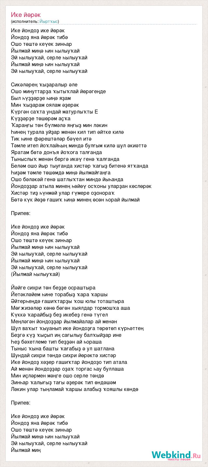 Ике йондоҙ ике йөрәк Йондоҙ яна йөрәк тибә Ошо төштә кеүек зинһар Йылмай миңә һин һылыуҡай Эй һылыуҡай, серле һылыуҡай Йылмай миңә һин һылыуҡай Эй һылыуҡай, серле һылыуҡай Сикәләрең ҡыҙаралыр әле Ошо минуттарҙа ҡытыҡлай йөрәгеңде Был һүҙҙәрҙе һиңә яҙам Мин ҡыҙарам оялам әҙерәк Күргән саҡта ундай матурлыҡты Е Күҙҙәрҙе төшөрәм аҫҡа Ҡараңғы төн бүлмәлә яңғыҙ мин ләкин Һинең турала уйҙар менән кил тип әйтке килә Тик һине фәрештәләр бәүел итә Тәмле итеп йоҡлайһың миндә булғым килә шул әкиәттә Яратам бөтә донъя йоҡоға талғанда Тыныслыҡ менән бергә икәү генә ҡалғанда Беләм ошо йыр тыуғанда хистәр ҡағыҙ битенә ятҡанда Һиҙәм тәмле төшөмдә миңә йылмайғаңға Ошо бәләкәй генә шатлыҡтан миндә йыһанда Йондоҙҙар атыла минең һөйөү осҡоны уларҙан көслөрәк Хистәр тиҙ һүнмәй улар ғүмере оҙонораҡ Бөтә күк йөҙө ғашиҡ һиңә минең өсөн һорай йылмай Припев: Ике йондоҙ ике йөрәк Йондоҙ яна йөрәк тибә Ошо төштә кеүек зинһар Йылмай миңә һин һылыуҡай Эй һылыуҡай, серле һылыуҡай Йылмай миңә һин һылыуҡай Эй һылыуҡай, серле һылыуҡай (Йылмай һылыуҡай) Йәйге сихри төн беҙҙе осраштыра Йетәкләйем һине торабыҙ ҡара ҡаршы Әйтерһеңдә ғашиҡтарҙы ҡош юлы тоташтыра Мөғжизәләр көнө бөгөн хыялдар тормошҡа аша Күккә ҡарайбыҙ беҙ икебеҙ генә түгел Меңләгән йондоҙҙар йылмайалар ай менән Шул ваҡыт ҡыуанып ике йондоҙға төрөтөп күрһәттең Беҙгә күҙ ҡыҫып иң сағылыу балҡыйҙар ине Һеҙ бәхетлеме тип беҙҙән ай һораша Тыныс ҡына башты ҡағабыҙ ә ул шатлана Шундай сихри төндә сихри йөрәктә хистәр Ике йондоҙ хәҙер ғашиҡтар йондоҙо тип атала Ай менән йондоҙҙар оҙаҡ торғас һау буллаша Мин иҫләрмен мәңге ошо серле төндө Зинһар ҡалығыҙ тағы әҙерәк тип өндәшәм Ләкин улар тыңламай ҡаршы алабыҙ ҡояшлы көндө Припев: Ике йондоҙ ике йөрәк Йондоҙ яна йөрәк тибә Ошо төштә кеүек зинһар Йылмай миңә һин һылыуҡай Эй һылыуҡай, серле һылыуҡай Йылмай миң