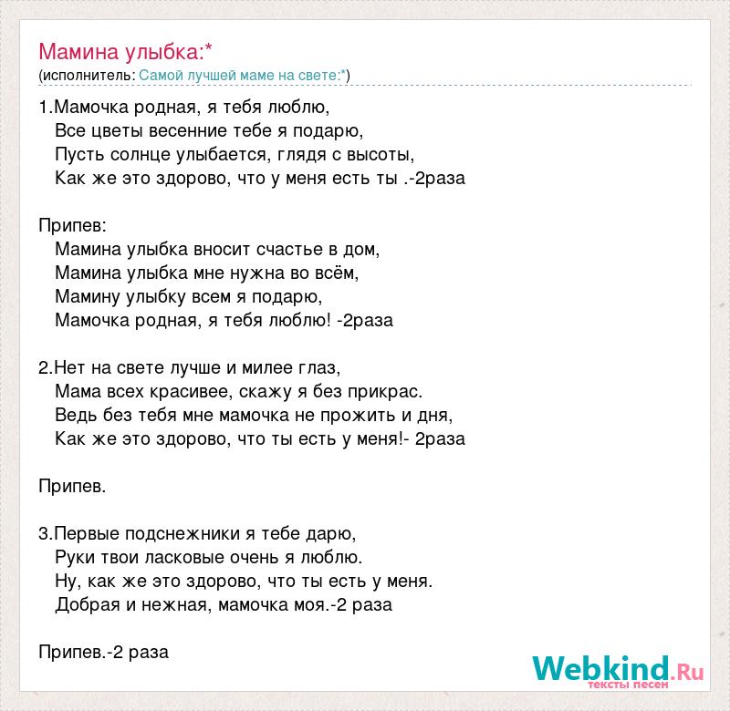 1.Мамочка родная, я тебя люблю, Все цветы весенние тебе я подарю, Пусть солнце улыбается, глядя с высоты, Как же это здорово, что у меня есть ты .-2раза Припев: Мамина улыбка вносит счастье в дом, Мамина улыбка мне нужна во всём, Мамину улыбку всем я подарю, Мамочка родная, я тебя люблю! -2раза 2.Нет на свете лучше и милее глаз, Мама всех красивее, скажу я без прикрас. Ведь без тебя мне мамочка не прожить и дня, Как же это здорово, что ты есть у меня!- 2раза Припев. 3.Первые подснежники я тебе дарю, Руки твои ласковые очень я люблю. Ну, как же это здорово, что ты есть у меня. Добрая и нежная, мамочка моя.-2 раза Припев.-2 раза