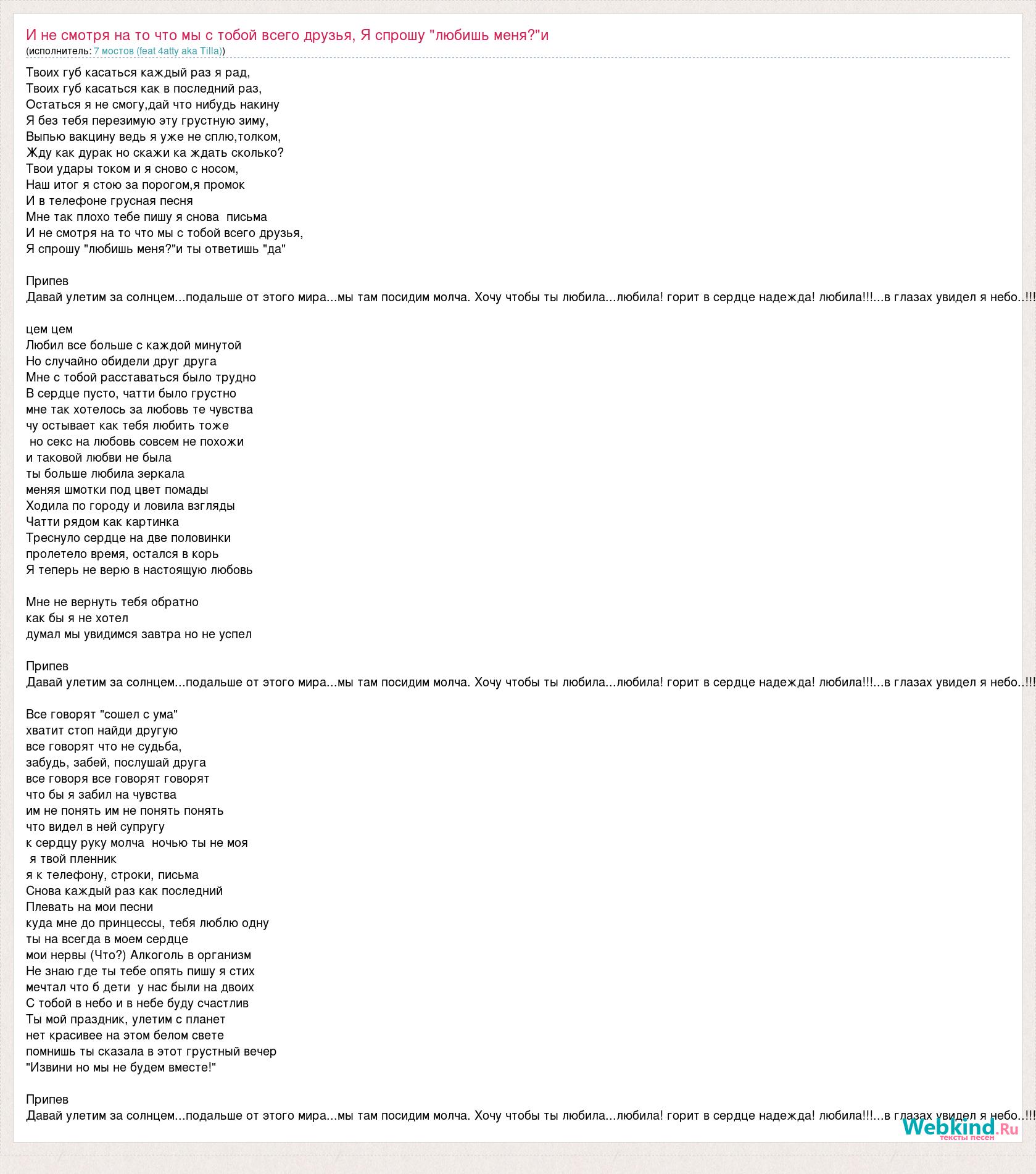 Главная→Исполнители→7 мостов (feat 4atty aka Tilla)→И не смотря на то что мы с тобой всего друзья, Я спрошу "любишь меня?"и