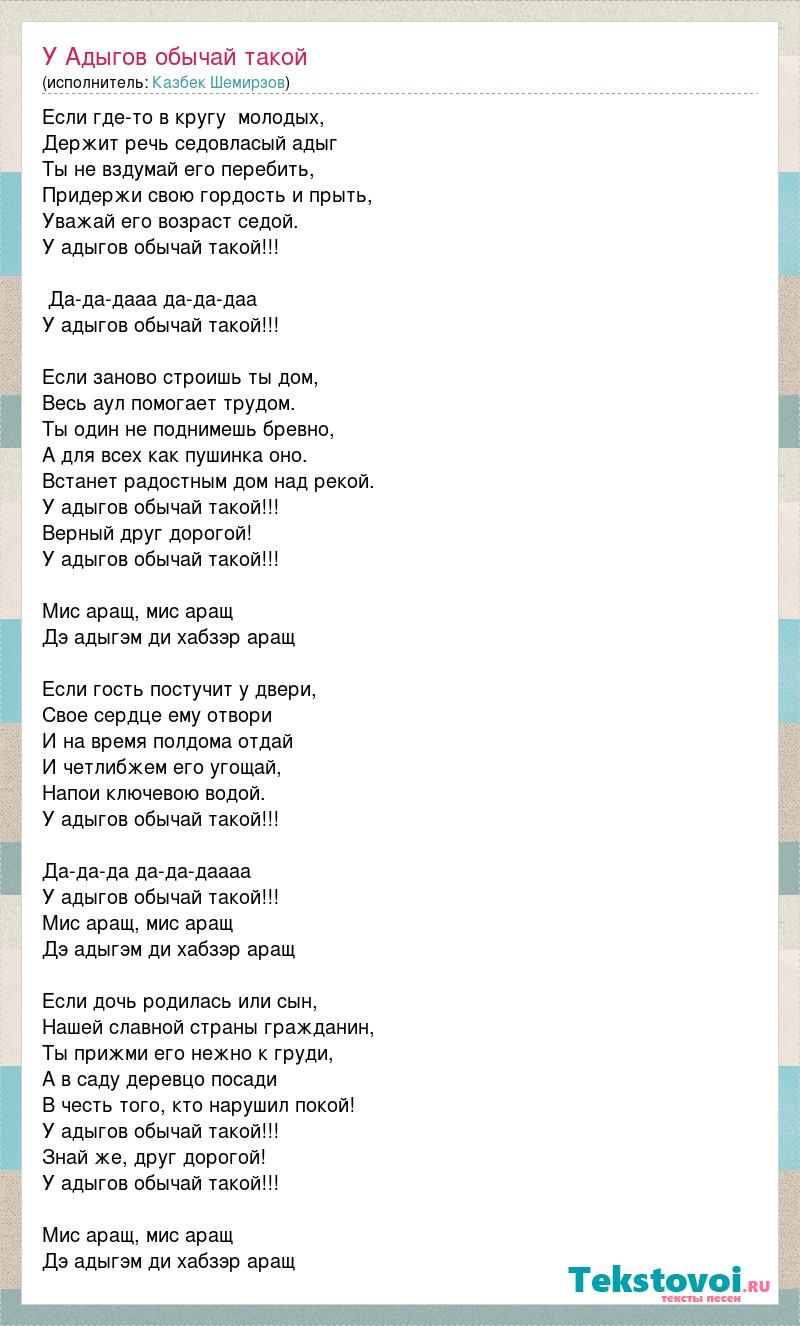 Если где-то в кругу молодых, Держит речь седовласый адыг Ты не вздумай его перебить, Придержи свою гордость и прыть, Уважай его возраст седой. У адыгов обычай такой!!! Да-да-дааа да-да-даа У адыгов обычай такой!!! Если заново строишь ты дом, Весь аул помогает трудом. Ты один не поднимешь бревно, А для всех как пушинка оно. Встанет радостным дом над рекой. У адыгов обычай такой!!! Верный друг дорогой! У адыгов обычай такой!!! Мис аращ, мис аращ Дэ адыгэм ди хабзэр аращ Если гость постучит у двери, Свое сердце ему отвори И на время полдома отдай И четлибжем его угощай, Напои ключевою водой. У адыгов обычай такой!!! Да-да-да да-да-даааа У адыгов обычай такой!!! Мис аращ, мис аращ Дэ адыгэм ди хабзэр аращ Если дочь родилась или сын, Нашей славной страны гражданин, Ты прижми его нежно к груди, А в саду деревцо посади В честь того, кто нарушил покой! У адыгов обычай такой!!! Знай же, друг дорогой! У адыгов обычай такой!!! Мис аращ, мис аращ Дэ адыгэм ди хабзэр аращ