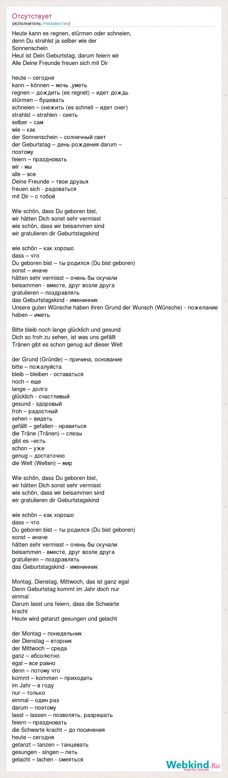 Heute kann es regnen, stürmen oder schneien, denn Du strahlst ja selber wie der Sonnenschein Heut ist Dein Geburtstag, darum feiern wir Alle Deine Freunde freuen sich mit Dir heute – сегодня kann – können – мочь ,уметь regnen – дождить (es regnet) – идет дождь stürmen – бушевать schneien – снежить (es schneit – идет снег) strahlst – strahlen - сиять selber – сам wie – как der Sonnenschein – солнечный свет der Geburtstag – день рождения darum – поэтому feiern – праздновать wir - мы alle – все Deine Freunde – твои друзья freuen sich - радоваться mit Dir – с тобой Wie schön, dass Du geboren bist, wir hätten Dich sonst sehr vermisst wie schön, dass wir beisammen sind wir gratulieren dir Geburtstagskind wie schön – как хорошо dass – что Du geboren bist – ты родился (Du bist geboren) sonst – иначе hätten sehr vermisst – очень бы скучали beisammen - вместе, друг возле друга gratulieren – поздравлять das Geburtstagskind - именинник Unsere guten Wünsche haben ihren Grund der Wunsch (Wünsche) - пожелание haben – иметь Bitte bleib noch lange glücklich und gesund Dich so froh zu sehen, ist was uns gefällt Tränen gibt es schon genug auf dieser Welt der Grund (Gründe) – причина, основание bitte – пожалуйста bleib – bleiben - оставаться noch – еще lange – долго glücklich - счастливый gesund - здоровый froh – радостный sehen – видеть gefällt – gefallen - нравиться die Träne (Tränen) – слезы gibt es –есть schon – уже genug – достаточно die Welt (Welten) – мир Wie schön, dass Du geboren bist, wir hätten Dich sonst sehr vermisst wie schön, dass wir beisammen sind wir gratulieren dir Geburtstagskind wie schön – как хорошо dass – что Du geboren bist – ты родился (Du bist geboren) sonst – иначе hätten sehr vermisst – очень бы скучали beisammen - вместе, друг возле друга gratulieren – поздравлять das Geburtstagskind - именинник Montag, Dienstag, Mittwoch, das ist ganz egal Denn Geburtstag kommt im Jahr doch nur einmal Darum lasst uns feiern, dass die Schwarte kracht Heute wird getanzt gesungen und gelacht der Montag – понедельник der Dienstag – вторник der Mittwoch – среда ganz – абсолютно egal – все равно denn – потому что kommt – kommen – приходить im Jahr – в году nur – только einmal – один раз darum – поэтому lasst – lassen – позволять, разрешать feiern – праздновать die Schwarte kracht – до посинения heute – сегодня getanzt – tanzen – танцевать gesungen - singen – петь gelacht – lachen - смеяться