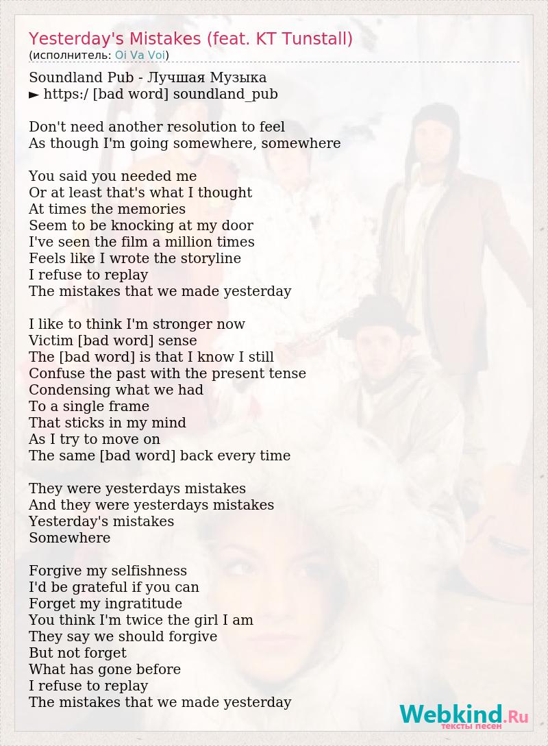 Soundland Pub - Лучшая Музыка ► https:/ [bad word] soundland_pub Don't need another resolution to feel As though I'm going somewhere, somewhere You said you needed me Or at least that's what I thought At times the memories Seem to be knocking at my door I've seen the film a million times Feels like I wrote the storyline I refuse to replay The mistakes that we made yesterday I like to think I'm stronger now Victim [bad word] sense The [bad word] is that I know I still Confuse the past with the present tense Condensing what we had To a single frame That sticks in my mind As I try to move on The same [bad word] back every time They were yesterdays mistakes And they were yesterdays mistakes Yesterday's mistakes Somewhere Forgive my selfishness I'd be grateful if you can Forget my ingratitude You think I'm twice the girl I am They say we should forgive But not forget What has gone before I refuse to replay The mistakes that we made yesterday