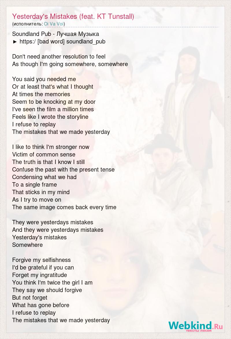 Soundland Pub - Лучшая Музыка ► https:/ [bad word] soundland_pub Don't need another resolution to feel As though I'm going somewhere, somewhere You said you needed me Or at least that's what I thought At times the memories Seem to be knocking at my door I've seen the film a million times Feels like I wrote the storyline I refuse to replay The mistakes that we made yesterday I like to think I'm stronger now Victim of common sense The truth is that I know I still Confuse the past with the present tense Condensing what we had To a single frame That sticks in my mind As I try to move on The same image comes back every time They were yesterdays mistakes And they were yesterdays mistakes Yesterday's mistakes Somewhere Forgive my selfishness I'd be grateful if you can Forget my ingratitude You think I'm twice the girl I am They say we should forgive But not forget What has gone before I refuse to replay The mistakes that we made yesterday