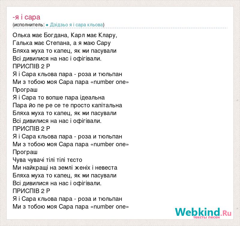 Олька має Богдана, Карл має Клару, Галька має Степана, а я маю Сару Бляха муха то капец, як ми пасували Всі дивилися на нас і офігівали. ПРИСПІВ 2 Р Я і Сара кльова пара - роза и тюльпан Ми з тобою моя Сара пара «number one» Програш Я і Сара то вопше пара ідеальна Пара йо пе ре се те просто капітальна Бляха муха то капец, як ми пасували Всі дивилися на нас і офігівали. ПРИСПІВ 2 Р Я і Сара кльова пара - роза и тюльпан Ми з тобою моя Сара пара «number one» Програш Чува чувачі тілі тілі тєсто Ми найкращі на землі женіх і невеста Бляха муха то капец, як ми пасували Всі дивилися на нас і офігівали. ПРИСПІВ 2 Р Я і Сара кльова пара - роза и тюльпан Ми з тобою моя Сара пара «number one»