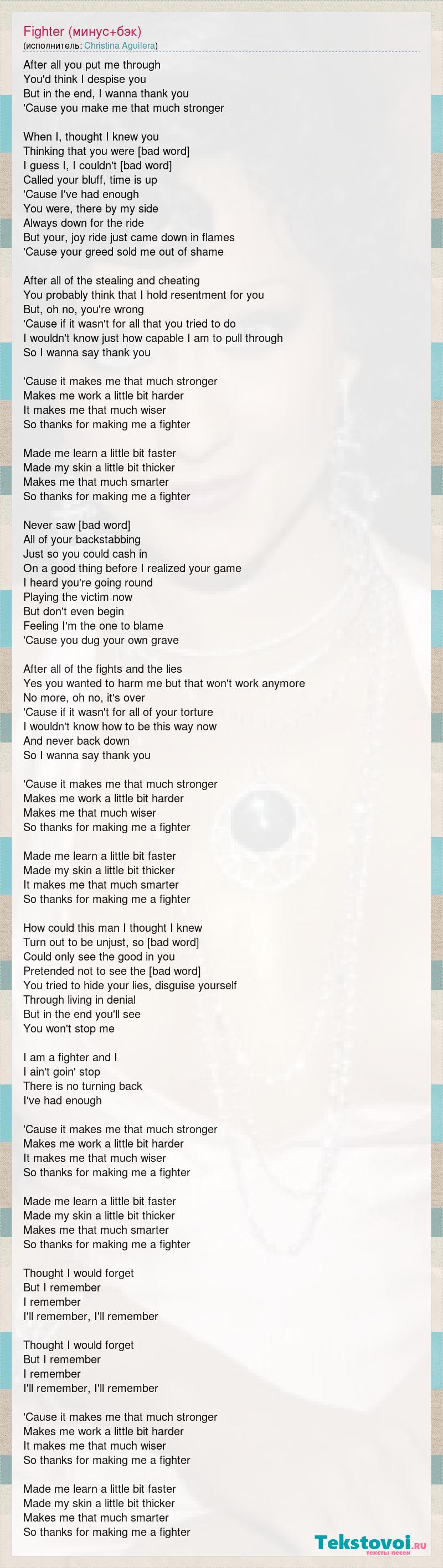 After all you put me through You'd think I despise you But in the end, I wanna thank you 'Cause you make me that much stronger When I, thought I knew you Thinking that you were true I guess I, I couldn't trust Called your bluff, time is up 'Cause I've had enough You were, there by my side Always down for the ride But your, joy ride just came down in flames 'Cause your greed sold me out of shame After all of the stealing and cheating You probably think that I hold resentment for you But, oh no, you're wrong 'Cause if it wasn't for all that you tried to do I wouldn't know just how capable I am to pull through So I wanna say thank you 'Cause it makes me that much stronger Makes me work a little bit harder It makes me that much wiser So thanks for making me a fighter Made me learn a little bit faster Made my skin a little bit thicker Makes me that much smarter So thanks for making me a fighter Never saw it coming All of your backstabbing Just so you could cash in On a good thing before I realized your game I heard you're going round Playing the victim now But don't even begin Feeling I'm the one to blame 'Cause you dug your own grave After all of the fights and the lies Yes you wanted to harm me but that won't work anymore No more, oh no, it's over 'Cause if it wasn't for all of your torture I wouldn't know how to be this way now And never back down So I wanna say thank you 'Cause it makes me that much stronger Makes me work a little bit harder Makes me that much wiser So thanks for making me a fighter Made me learn a little bit faster Made my skin a little bit thicker It makes me that much smarter So thanks for making me a fighter How could this man I thought I knew Turn out to be unjust, so cruel Could only see the good in you Pretended not to see the truth You tried to hide your lies, disguise yourself Through living in denial But in the end you'll see You won't stop me I am a fighter and I I ain't goin' stop There is no turning back I've had enough 'Cause it makes me that much stronger Makes me work a little bit harder It makes me that much wiser So thanks for making me a fighter Made me learn a little bit faster Made my skin a little bit thicker Makes me that much smarter So thanks for making me a fighter Thought I would forget But I remember I remember I'll remember, I'll remember Thought I would forget But I remember I remember I'll remember, I'll remember 'Cause it makes me that much stronger Makes me work a little bit harder It makes me that much wiser So thanks for making me a fighter Made me learn a little bit faster Made my skin a little bit thicker Makes me that much smarter So thanks for making me a fighter