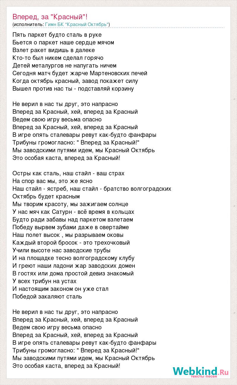 Пять паркет будто сталь в руке Бьется о паркет наше сердце мячом Взлет ракет видишь в далеке Кто-то был никем сделал горячо Детей металургов не напугать ничем Сегодня матч будет жарче Мартеновских печей Когда октябрь красный, завод покажет силу Вышел против нас ты - подставляй корзину Не верил в нас ты друг, это напрасно Вперед за Красный, хей, вперед за Красный Ведем свою игру весьма опасно Вперед за Красный, хей, вперед за Красный В игре опять сталевары ревут как-будто фанфары Трибуны громогласно: " Вперед за Красный!" Мы заводскими путями идем, мы Красный Октябрь Это особая каста, вперед за Красный! Остры как сталь, наш стайл - ваш страх На спор вас мы, это же ясно Наш стайл - ястреб, наш стайл - братство волгоградских Октябрь будет красным Мы творим красоту, мы зажигаем солнце У нас мяч как Сатурн - всё время в кольцах Будто ради забавы над паркетом взлетаем Победу вырвем зубами даже в овертайме Наш полет высок , мы разрываем оковы Каждый второй бросок - это трехочковый Учили высоте нас заводские трубы И на площадке тесно волгоградскому клубу И греют наши ладони жар заводских домен В гостях или дома простой девиз знакомый У всех трибун на устах И настоящим законом он уже стал Победой закаляют сталь Не верил в нас ты друг, это напрасно Вперед за Красный, хей, вперед за Красный Ведем свою игру весьма опасно Вперед за Красный, хей, вперед за Красный В игре опять сталевары ревут как-будто фанфары Трибуны громогласно: " Вперед за Красный!" Мы заводскими путями идем, мы Красный Октябрь Это особая каста, вперед за Красный!