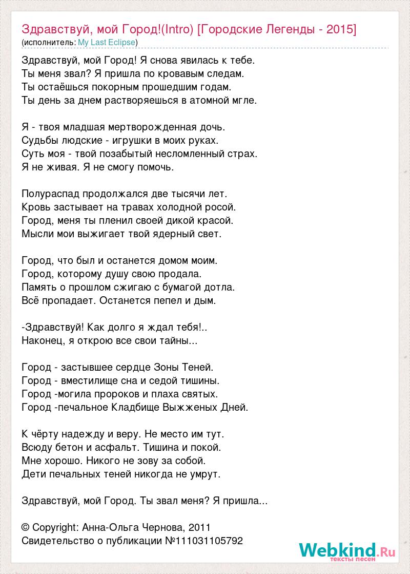 А как ты думаешь, о чем песня "Здравствуй, мой Город!(Intro) [Городские Легенды - 2015]" ?