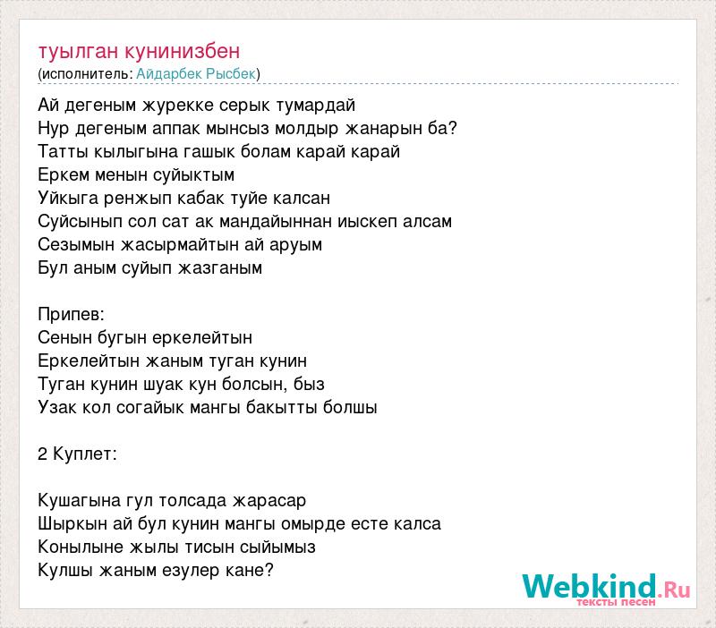 Ай дегеным журекке серык тумардай Нур дегеным аппак мынсыз молдыр жанарын ба? Татты кылыгына гашык болам карай карай Еркем менын суйыктым Уйкыга ренжып кабак туйе калсан Суйсынып сол сат ак мандайыннан иыскеп алсам Сезымын жасырмайтын ай аруым Бул аным суйып жазганым Припев: Сенын бугын еркелейтын Еркелейтын жаным туган кунин Туган кунин шуак кун болсын, быз Узак кол согайык мангы бакытты болшы 2 Куплет: Кушагына гул толсада жарасар Шыркын ай бул кунин мангы омырде есте калса Конылыне жылы тисын сыйымыз Кулшы жаным езулер кане?