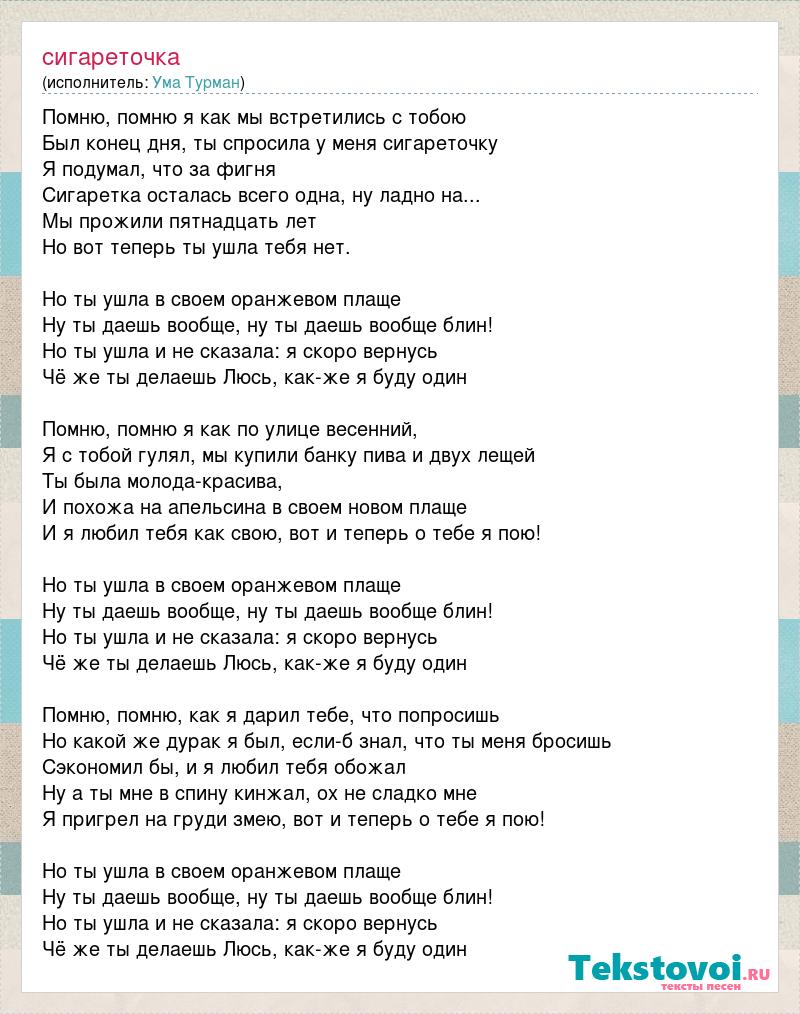 Помню, помню я как мы встретились с тобою Был конец дня, ты спросила у меня сигареточку Я подумал, что за фигня Сигаретка осталась всего одна, ну ладно на... Мы прожили пятнадцать лет Но вот теперь ты ушла тебя нет. Но ты ушла в своем оранжевом плаще Ну ты даешь вообще, ну ты даешь вообще блин! Но ты ушла и не сказала: я скоро вернусь Чё же ты делаешь Люсь, как-же я буду один Помню, помню я как по улице весенний, Я с тобой гулял, мы купили банку пива и двух лещей Ты была молода-красива, И похожа на апельсина в своем новом плаще И я любил тебя как свою, вот и теперь о тебе я пою! Но ты ушла в своем оранжевом плаще Ну ты даешь вообще, ну ты даешь вообще блин! Но ты ушла и не сказала: я скоро вернусь Чё же ты делаешь Люсь, как-же я буду один Помню, помню, как я дарил тебе, что попросишь Но какой же дурак я был, если-б знал, что ты меня бросишь Сэкономил бы, и я любил тебя обожал Ну а ты мне в спину кинжал, ох не сладко мне Я пригрел на груди змею, вот и теперь о тебе я пою! Но ты ушла в своем оранжевом плаще Ну ты даешь вообще, ну ты даешь вообще блин! Но ты ушла и не сказала: я скоро вернусь Чё же ты делаешь Люсь, как-же я буду один