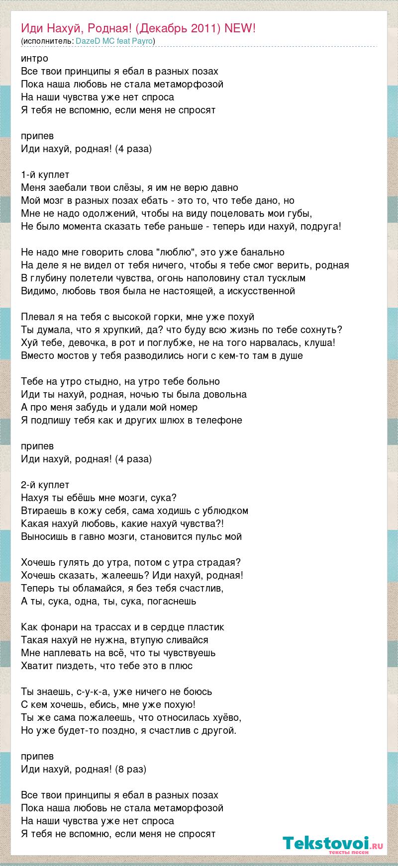 интро Все твои принципы я ебал в разных позах Пока наша любовь не стала метаморфозой На наши чувства уже нет спроса Я тебя не вспомню, если меня не спросят припев Иди нахуй, родная! (4 раза) 1-й куплет Меня заебали твои слёзы, я им не верю давно Мой мозг в разных позах ебать - это то, что тебе дано, но Мне не надо одолжений, чтобы на виду поцеловать мои губы, Не было момента сказать тебе раньше - теперь иди нахуй, подруга! Не надо мне говорить слова "люблю", это уже банально На деле я не видел от тебя ничего, чтобы я тебе смог верить, родная В глубину полетели чувства, огонь наполовину стал тусклым Видимо, любовь твоя была не настоящей, а искусственной Плевал я на тебя с высокой горки, мне уже похуй Ты думала, что я хрупкий, да? что буду всю жизнь по тебе сохнуть? Хуй тебе, девочка, в рот и поглубже, не на того нарвалась, клуша! Вместо мостов у тебя разводились ноги с кем-то там в душе Тебе на утро стыдно, на утро тебе больно Иди ты нахуй, родная, ночью ты была довольна А про меня забудь и удали мой номер Я подпишу тебя как и других шлюх в телефоне припев Иди нахуй, родная! (4 раза) 2-й куплет Нахуя ты ебёшь мне мозги, сука? Втираешь в кожу себя, сама ходишь с ублюдком Какая нахуй любовь, какие нахуй чувства?! Выносишь в гавно мозги, становится пульс мой Хочешь гулять до утра, потом с утра страдая? Хочешь сказать, жалеешь? Иди нахуй, родная! Теперь ты обламайся, я без тебя счастлив, А ты, сука, одна, ты, сука, погаснешь Как фонари на трассах и в сердце пластик Такая нахуй не нужна, втупую сливайся Мне наплевать на всё, что ты чувствуешь Хватит пиздеть, что тебе это в плюс Ты знаешь, с-у-к-а, уже ничего не боюсь С кем хочешь, ебись, мне уже похую! Ты же сама пожалеешь, что относилась хуёво, Но уже будет-то поздно, я счастлив с другой. припев Иди нахуй, родная! (8 раз) Все твои принципы я ебал в разных позах Пока наша любовь не стала метаморфозой На наши чувства уже нет спроса Я тебя не вспомню, если меня не спросят