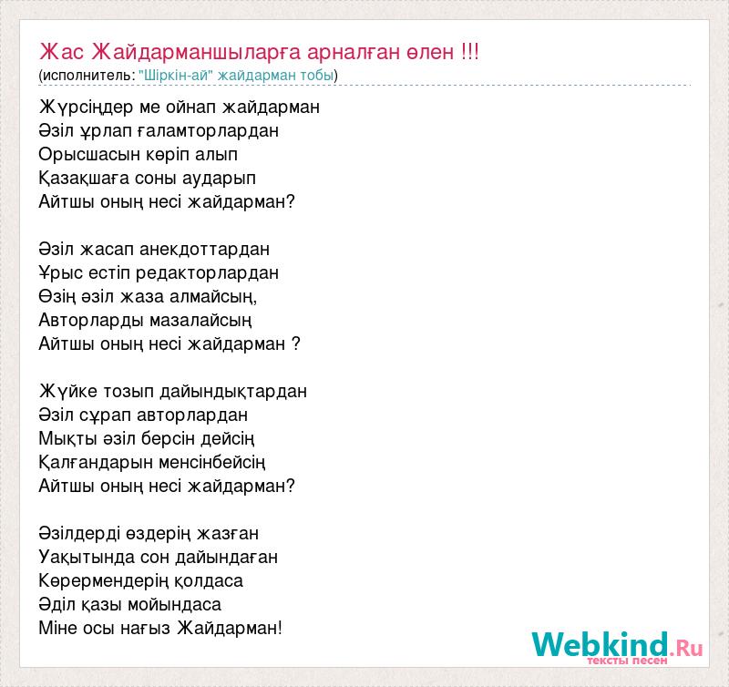 Жүрсіңдер ме ойнап жайдарман Әзіл ұрлап ғаламторлардан Орысшасын көріп алып Қазақшаға соны аударып Айтшы оның несі жайдарман? Әзіл жасап анекдоттардан Ұрыс естіп редакторлардан Өзің әзіл жаза алмайсың, Авторларды мазалайсың Айтшы оның несі жайдарман ? Жүйке тозып дайындықтардан Әзіл сұрап авторлардан Мықты әзіл берсін дейсің Қалғандарын менсінбейсің Айтшы оның несі жайдарман? Әзілдерді өздерің жазған Уақытында сон дайындаған Көрермендерің қолдаса Әділ қазы мойындаса Міне осы нағыз Жайдарман!
