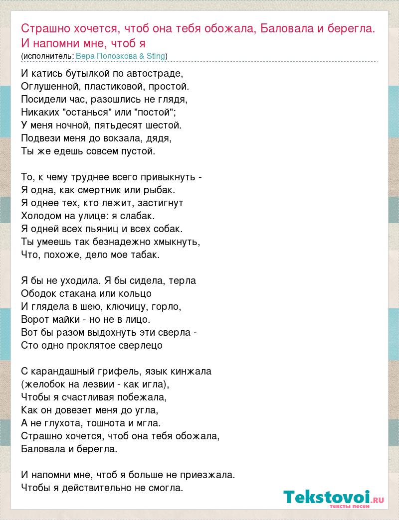 Главная→Исполнители→Вера Полозкова & Sting→Страшно хочется, чтоб она тебя обожала, Баловала и берегла. И напомни м