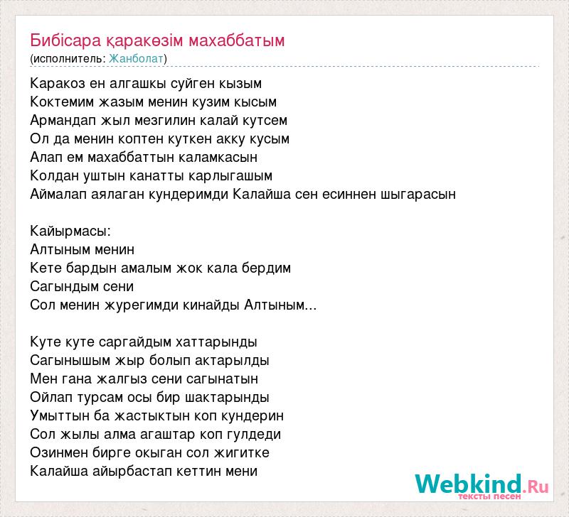 Каракоз ен алгашкы суйген кызым Коктемим жазым менин кузим кысым Армандап жыл мезгилин калай кутсем Ол да менин коптен куткен акку кусым Алап ем махаббаттын каламкасын Колдан уштын канатты карлыгашым Аймалап аялаган кундеримди Калайша сен есиннен шыгарасын Кайырмасы: Алтыным менин Кете бардын амалым жок кала бердим Сагындым сени Сол менин журегимди кинайды Алтыным... Куте куте саргайдым хаттарынды Сагынышым жыр болып актарылды Мен гана жалгыз сени сагынатын Ойлап турсам осы бир шактарынды Умыттын ба жастыктын коп кундерин Сол жылы алма агаштар коп гулдеди Озинмен бирге окыган сол жигитке Калайша айырбастап кеттин мени
