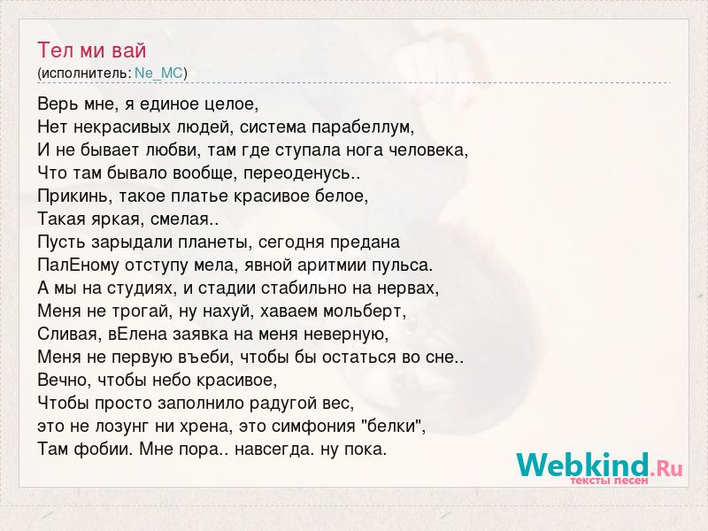 Верь мне, я единое целое, Нет некрасивых людей, система парабеллум, И не бывает любви, там где ступала нога человека, Что там бывало вообще, переоденусь.. Прикинь, такое платье красивое белое, Такая яркая, смелая.. Пусть зарыдали планеты, сегодня предана ПалЕному отступу мела, явной аритмии пульса. А мы на студиях, и стадии стабильно на нервах, Меня не трогай, ну нахуй, хаваем мольберт, Сливая, вЕлена заявка на меня неверную, Меня не первую въеби, чтобы бы остаться во сне.. Вечно, чтобы небо красивое, Чтобы просто заполнило радугой вес, это не лозунг ни хрена, это симфония "белки", Там фобии. Мне пора.. навсегда. ну пока.