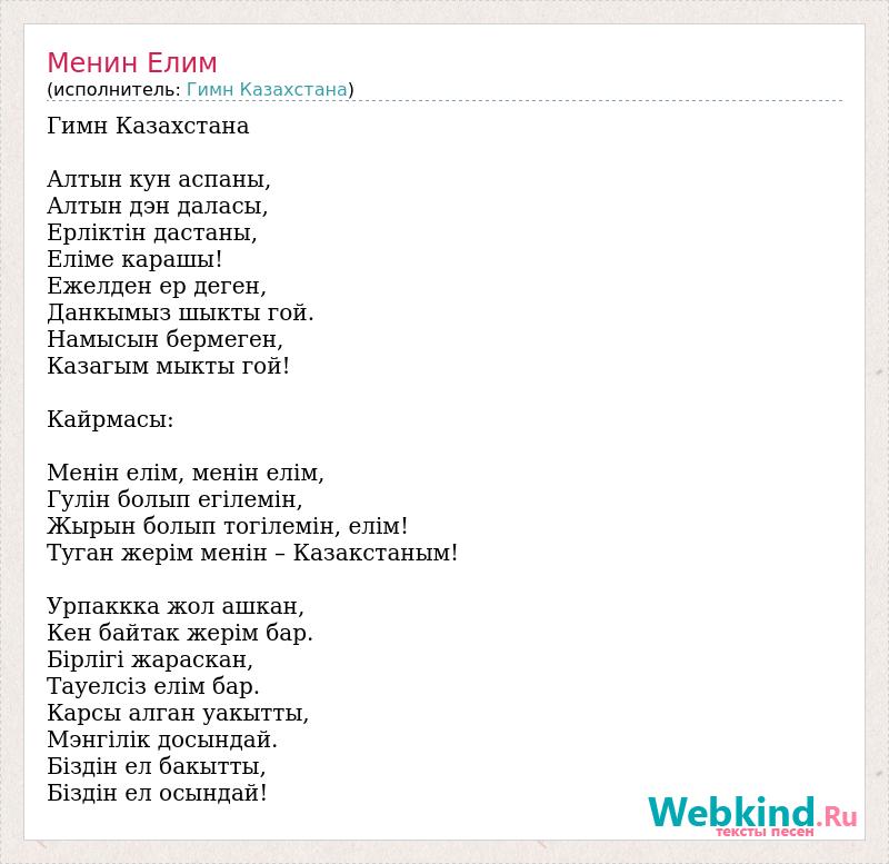 Гимн Казахстана Алтын кун аспаны, Алтын дэн даласы, Ерлiктiн дастаны, Елiме карашы! Ежелден ер деген, Данкымыз шыкты гой. Намысын бермеген, Казагым мыкты гой! Кайрмасы: Менiн елiм, менiн елiм, Гулiн болып егiлемiн, Жырын болып тогiлемiн, елiм! Туган жерiм менiн – Казакстаным! Урпаккка жол ашкан, Кен байтак жерiм бар. Бiрлiгi жараскан, Тауелсiз елiм бар. Карсы алган уакытты, Мэнгiлiк досындай. Бiздiн ел бакытты, Бiздiн ел осындай!