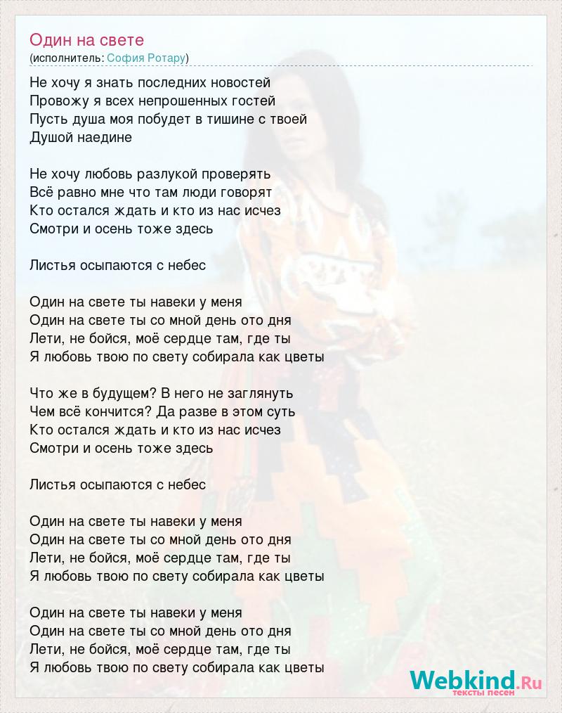 Не хочу я знать последних новостей Провожу я всех непрошенных гостей Пусть душа моя побудет в тишине с твоей Душой наедине Не хочу любовь разлукой проверять Всё равно мне что там люди говорят Кто остался ждать и кто из нас исчез Смотри и осень тоже здесь Листья осыпаются с небес Один на свете ты навеки у меня Один на свете ты со мной день ото дня Лети, не бойся, моё сердце там, где ты Я любовь твою по свету собирала как цветы Что же в будущем? В него не заглянуть Чем всё кончится? Да разве в этом суть Кто остался ждать и кто из нас исчез Смотри и осень тоже здесь Листья осыпаются с небес Один на свете ты навеки у меня Один на свете ты со мной день ото дня Лети, не бойся, моё сердце там, где ты Я любовь твою по свету собирала как цветы Один на свете ты навеки у меня Один на свете ты со мной день ото дня Лети, не бойся, моё сердце там, где ты Я любовь твою по свету собирала как цветы